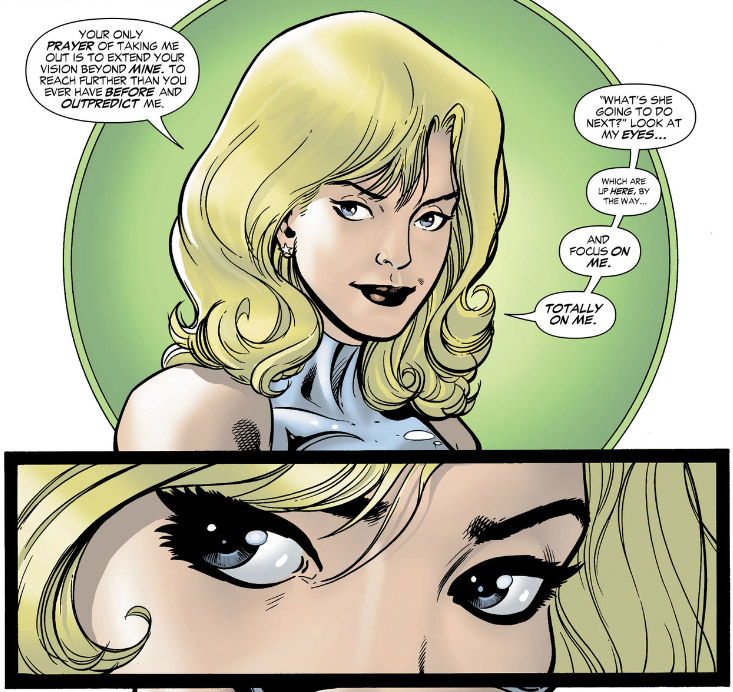 Specifically, she has prophetic dreams. She can use various meditative techniques to look for particular events. Sometimes, writers will give her the ability to look a few seconds into the future for combat purposes.