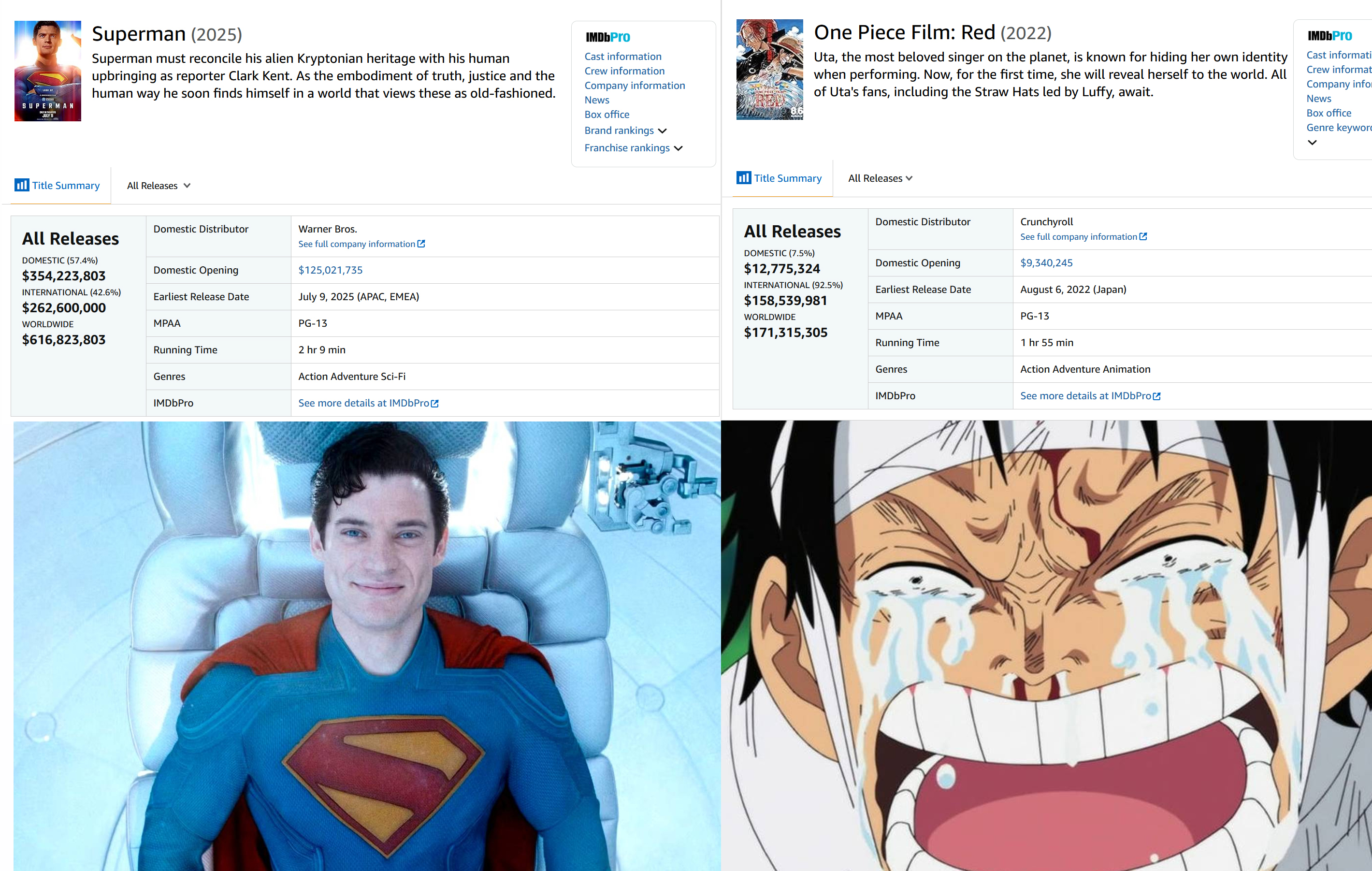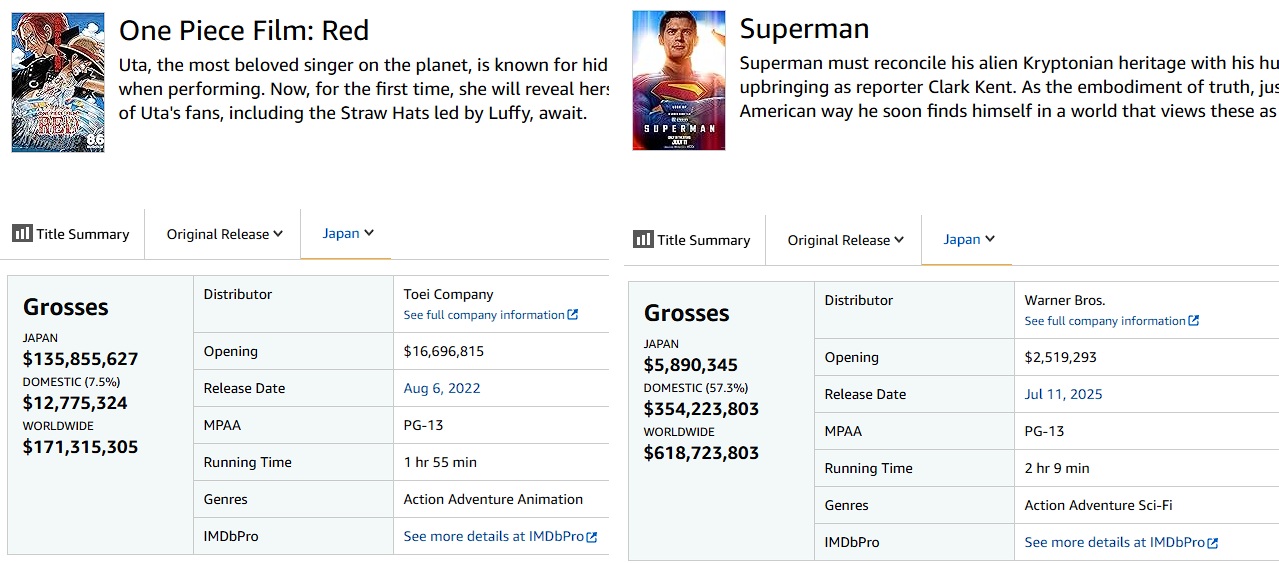 >>153138631Japan was the only market One piece was given a full box office run. All other markets either didn't carry it or only had it in select theaters for just one weekend. So something that was barely in theaters still got 1/6 superman's gross? Sounds like a win for One Piece to pull that much while barely in theaters vs something that had a full run.Oh, did you think your image was a dunk on it? Funny.