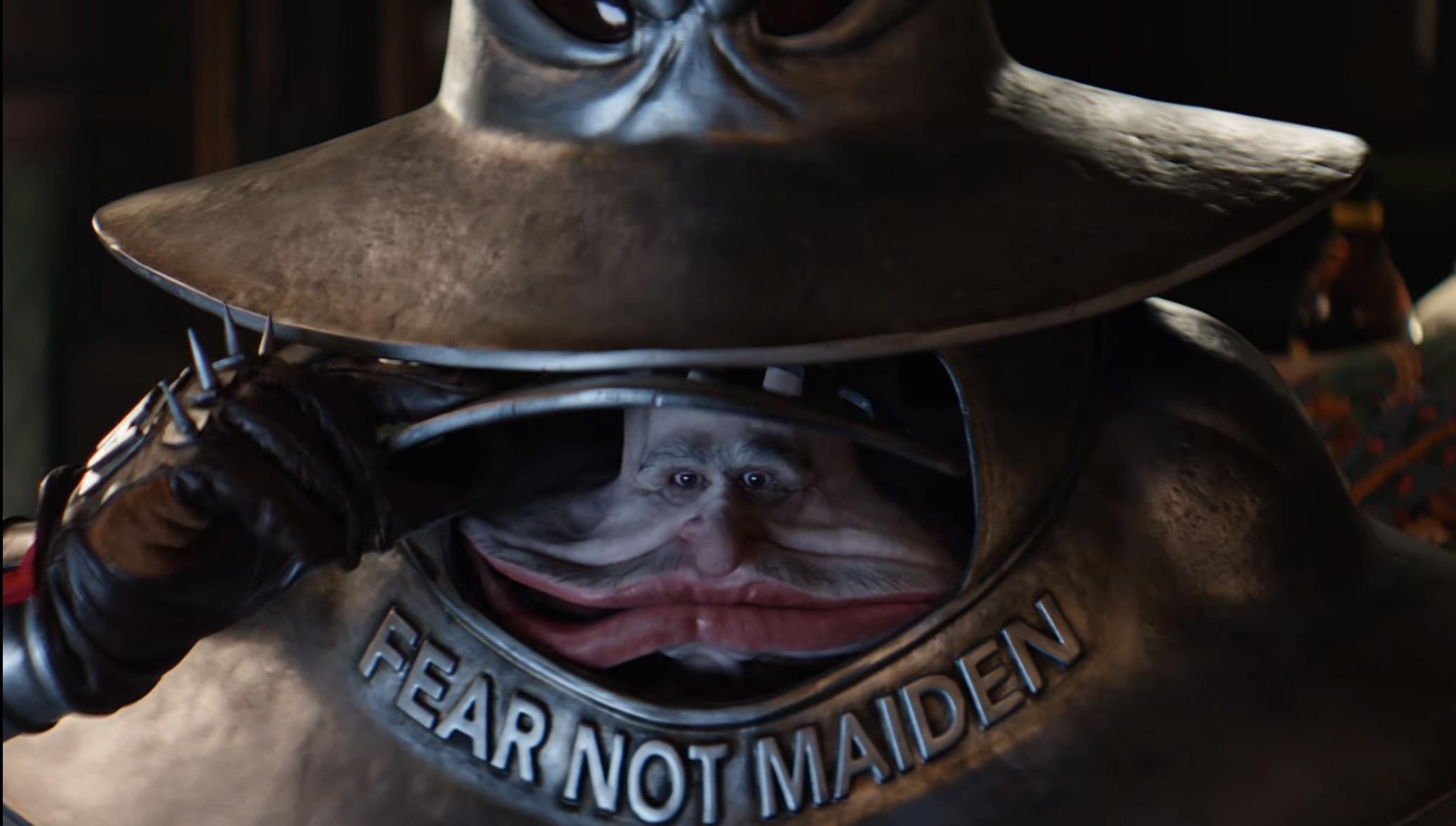 Did anybody catch what's written on the guy's gauntlets?