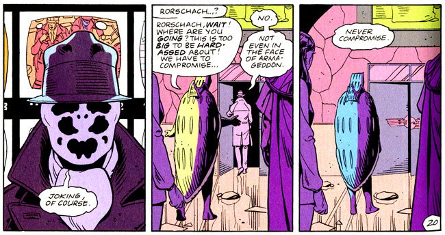 >never compromise, not even in the face of Armageddon Apart from Rorschach, which other characters do you think this would describe? They don't even have to share the same morality, I'm more curious to see which ones people think have the same unshakeable personal code. In all honesty I think it's very common amongst the usual totally-anti-heroes-but-actually-villains characters too.And in all honesty, I don't get why people think Moore intended for him to be the "villain". Moore's just a contrarian. RorShaq is obviously the closest thing the book has to a moral character. He's written as a supreme chud who, in the end, is the only guy willing to fight for all the "whores and politicians". The ending is Moore essentially deifying Walter in contrast with Manhattan shutting Veidt's delusions down. For me, Watchmen is sort of an exploration of the concept of the Ubermensch. Laurie and Dan are merely LARPers, normalfags. Comedian is a broken nihilist who, in his last moments, betrays himself. Manhattan ascends humanity. Veidt reaches for the stars but ultimately is all too human, wracked by guilt. RorShaqalacka lives by a moral code to end but is generally unable to go beyond the established rules of conduct. All of them fail to become something higher.