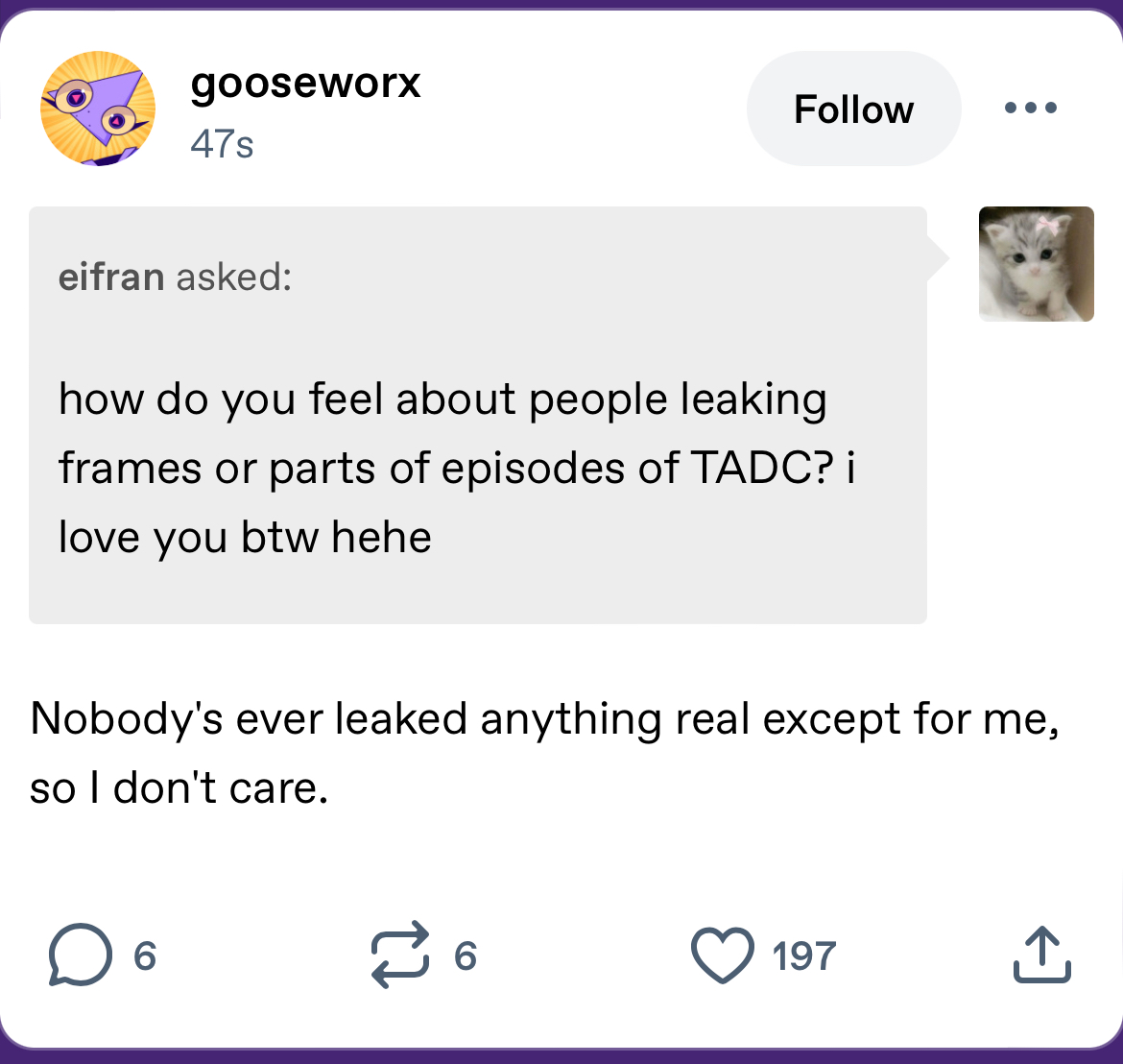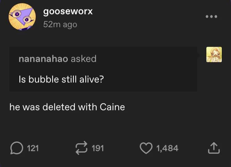 Goose’s round of tumblr answers be like:>Gummigoo is coming back + the funnybunny ads aren’t canon + jax is trans