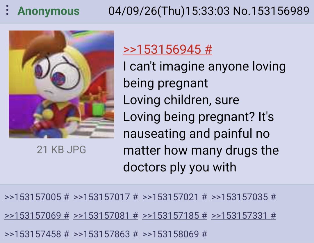 >>153156945I can't imagine anyone loving being pregnantLoving children, sureLoving being pregnant? It's nauseating and painful no matter how many drugs the doctors ply you with