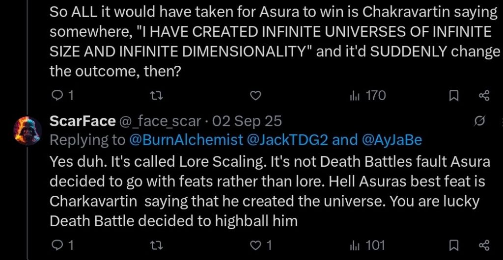 A guy comes up to you and says X can beat your favorite character, you ask him why.He says:>He has outer scalingWhat do you respond with?
