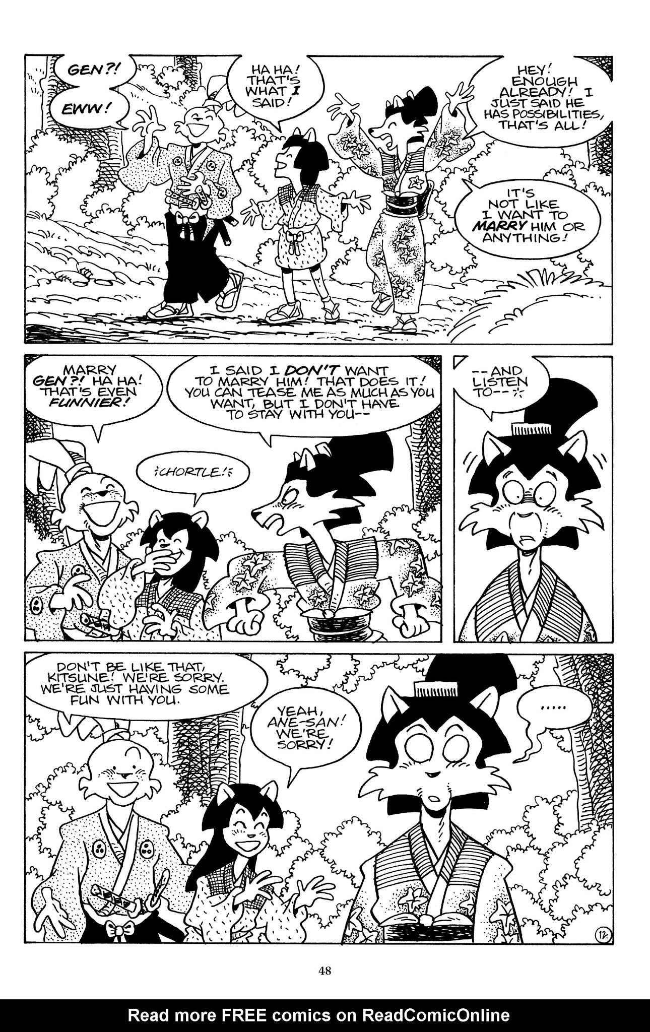 half the reason I support gen and kitsune getting together is to get kiyoko a better role model to emulate...>>153201603it's part of the tragedy, they both would be great together but, out of honor and sense of duty, tomoe can't leave her post and usagi doesn't want to settle down. incidentally, it's also why I like mayumi, she was willing to forego anything and stay with usagi on his travels. she might be clingy and slightly unstable but damn it she was trying to give her all. (and she did)>Any spoiler anons wanna tell me how that eventually plays out?there's a small moment with BIG implications in the most recent stories, you'll see when we get to the IDW run. but there's also Senso, a half-canon half-spinoff that takes place in the future and shows tomoe married the other guy...