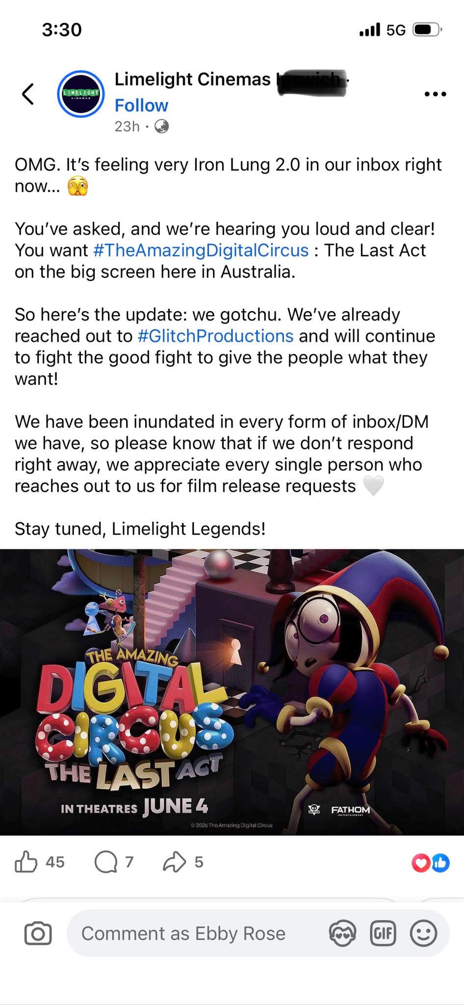 >>153213235Limelight cinemas has publicly announced they are in contact with Glitch