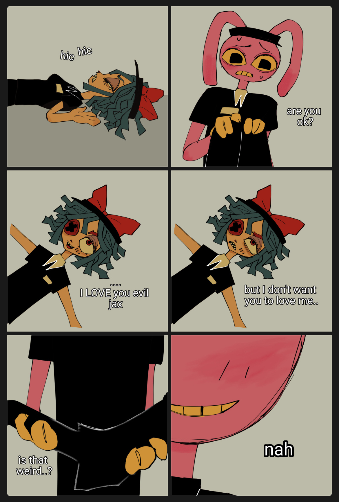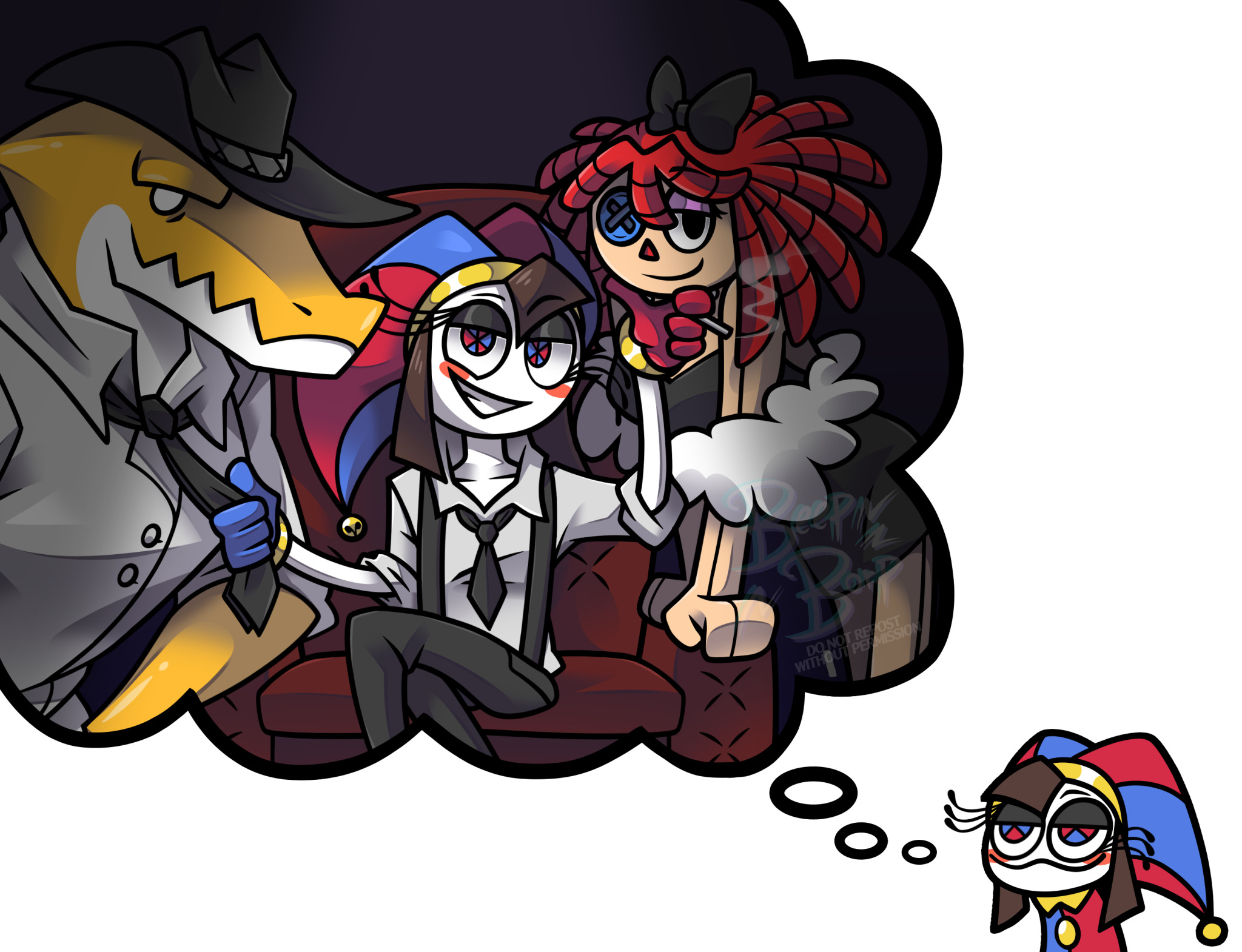 Pomni, Ragatha, Gangle and Zooble belong to Anon. Jax is Anon’s asexual best friend who mellowed out, and Kinger is our based uncle.