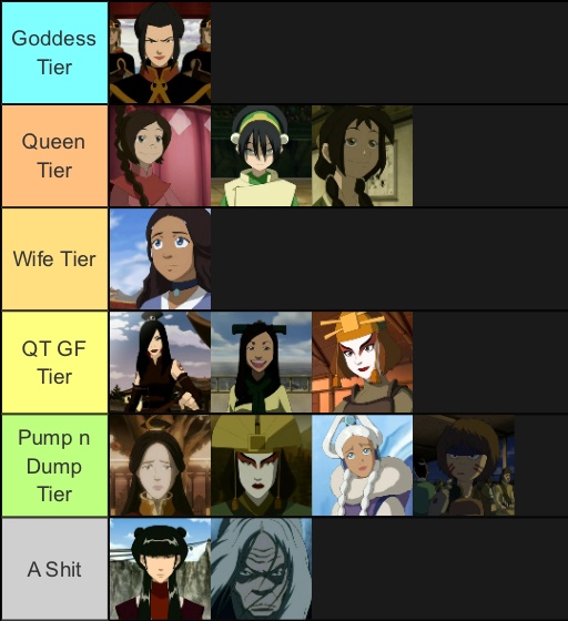 >>153215835yea until otherwise, i'm going with this. knocks two birds with one stone where Toph gets someone good, and Zuko gets anyone besides Mai kek,