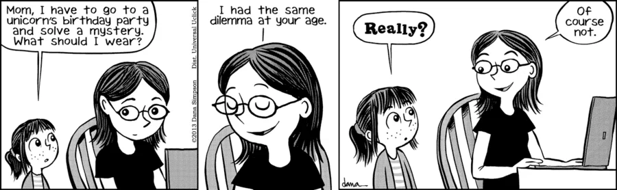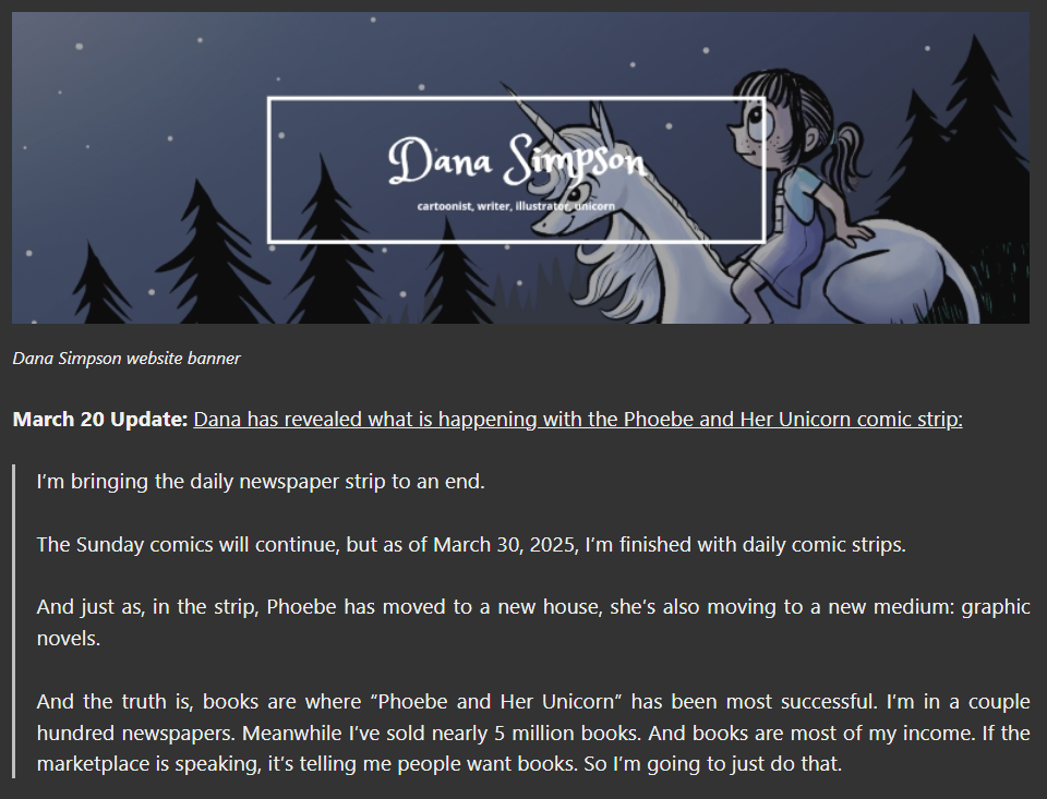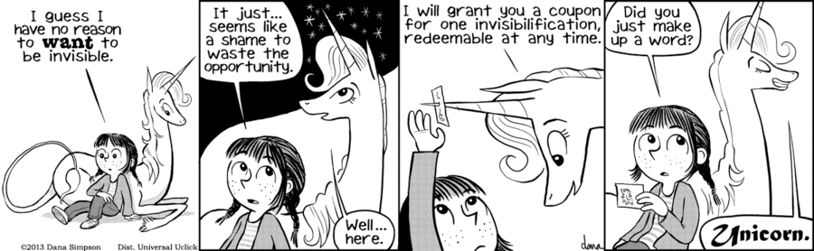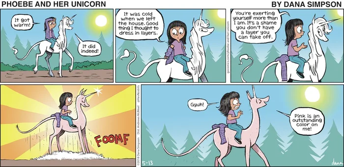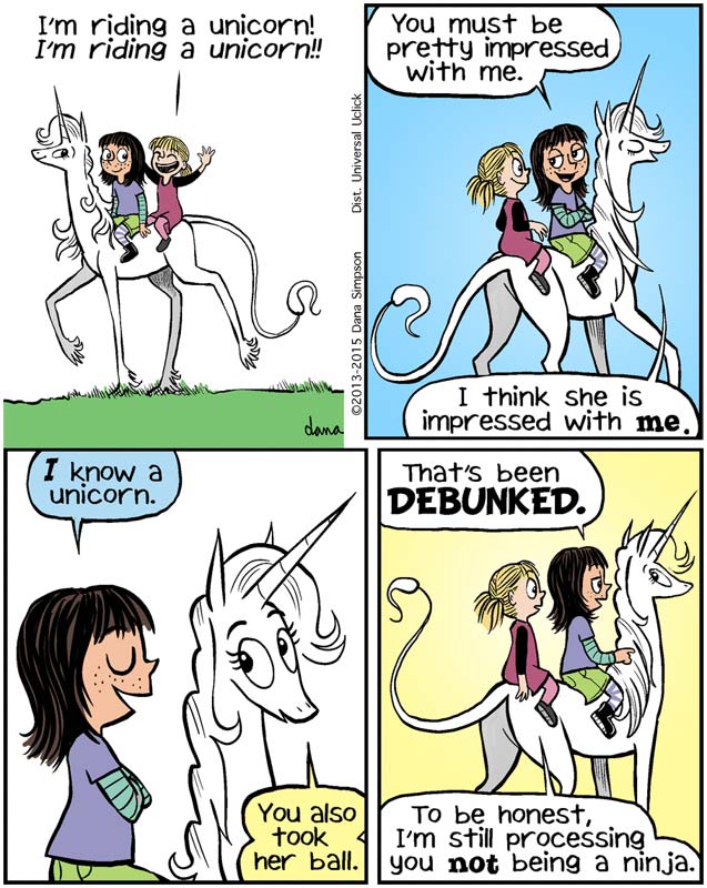 >>153232292Dave/Dana Simpson may be batshit crazy, but both "Ozy and Millie" and "Phoebe and Her Unicorn" are good, solid humor comics. He/she/it is doing something right here.