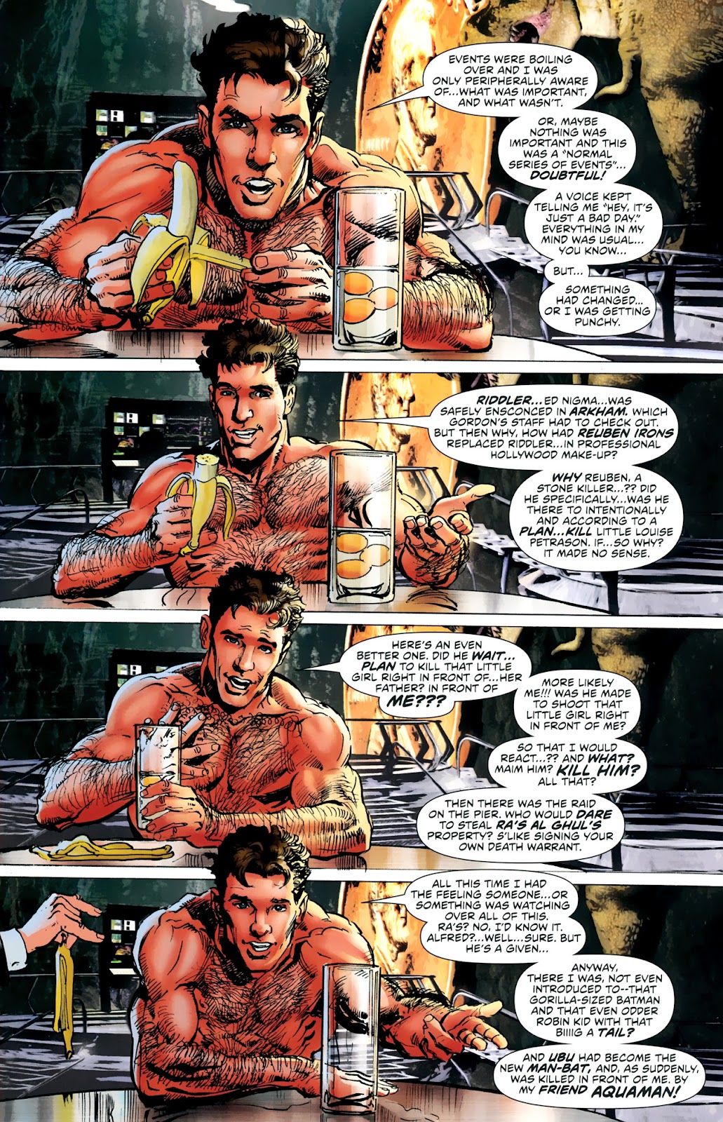BRUCE WHY ARE YOU TELLING ME ALL THIS SHIRTLESS AND EATING BANANA? ARE YOU TRYING TO SEDUCE ME INTO HAVING SUPERBATSEX IN YOUR BATCAVE? WELL IT'S WORKING!