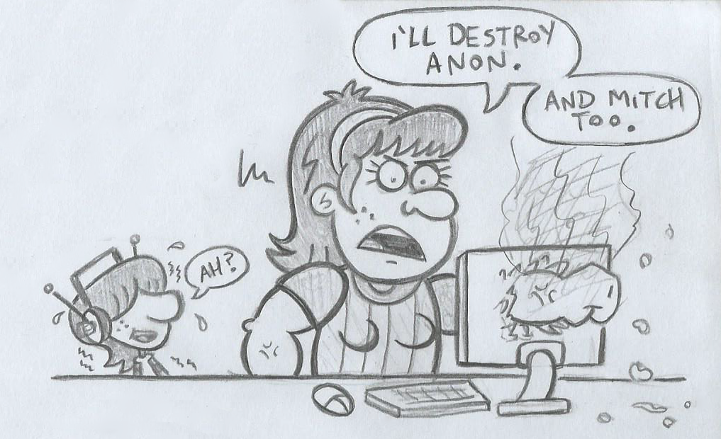 >>153228493Pam finds 4chan and goes on a psycho rampage over her secret love for Cubey and getting mad at shippers.Bonus if Mitch is somehow there, confused by her hatred for him.