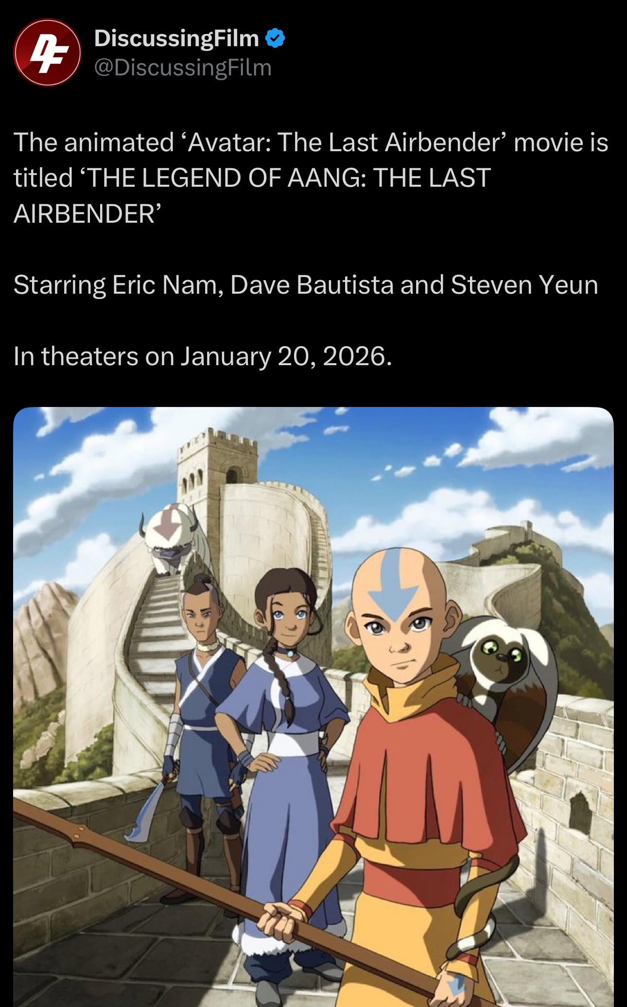 O.K. finally finished it. Main complaints:> Dave Bautista makes an Air Scooter when he saves Aang from falling. This is nonsensical, Aang invented the air scooter and it's the technique that earned him his master tattoos. Canonically no one had ever done this before Aang.> Aang dies in the Avatar state and nothing happens. We've seen what this looks like in the Season 2 finale this is inconsistent with established canon, even if he was brought back and it should be taken longer for him to come to. Last time this happened he was in a coma for months.> Everything has too much backlighting > Dave Bautista is Asian enough to be in Avatar because he's Filipino but Dante Brasco isn't Asian enough to be in Avatar because he's Filipino. I will not let this go, we are owed an apology.> It's dumb that the denied become instant masters of airbending. Even the avatar has to train for a long time to master bending.> > If they were going to do an Airbender Avatar they should've either used Yangchen if they wanted a girl or made it a male Airbender Avatar. This new girl just detracts from her and is something we've already seen. Another make Airbender Avatar would've been hype> The denied girls would've worked better if they were father and son> I wish Republic City wasn't around quite yet and we could still see some awkwardness among the fire nation colonies> The voice actors are just not it. They should've never replaced the main cast> Aang should've summoned the Lion Turtle instead of the ocean spirit> The staff doesn't make sense, they should've had some folktale backstory about it being made out of a special tree or something > Iroh, Suki, Azula, and Ty Lee should've all been in it