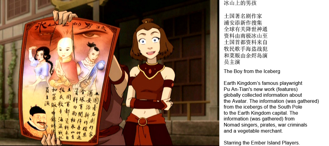 >>>153230596>earth kingdom and fire nation use hanziIn the movie? I was fearing they replaced all the archaic Chinese with some made up babble like >>153230488 didIn the original the entire world seemed to have been literate in some old form of Chinese.The water tribes should've been in Inuktitut.