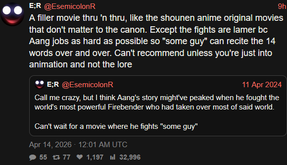 >nostalgia grab movie is unironically goodand it was fucking ATLA of all cursed franchises.