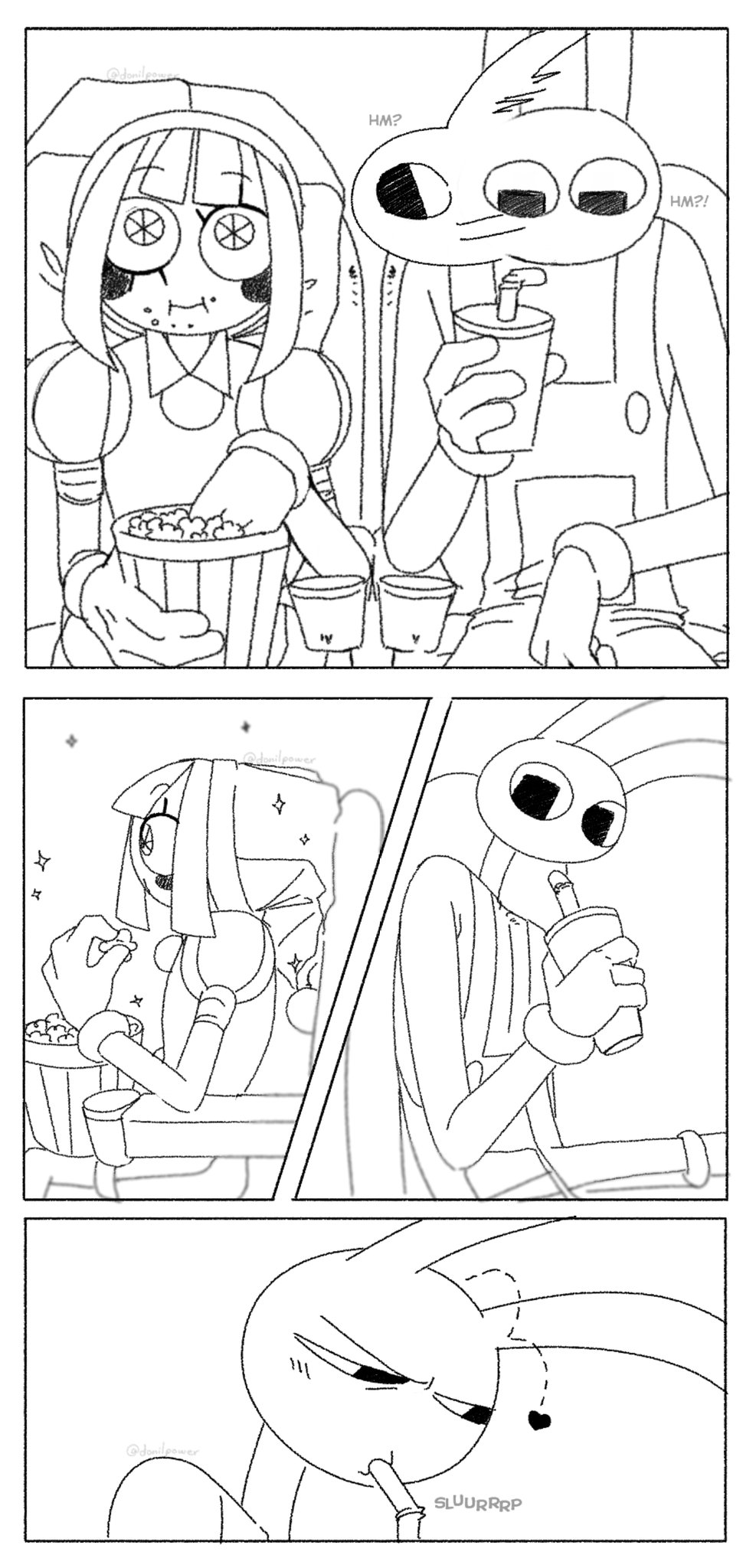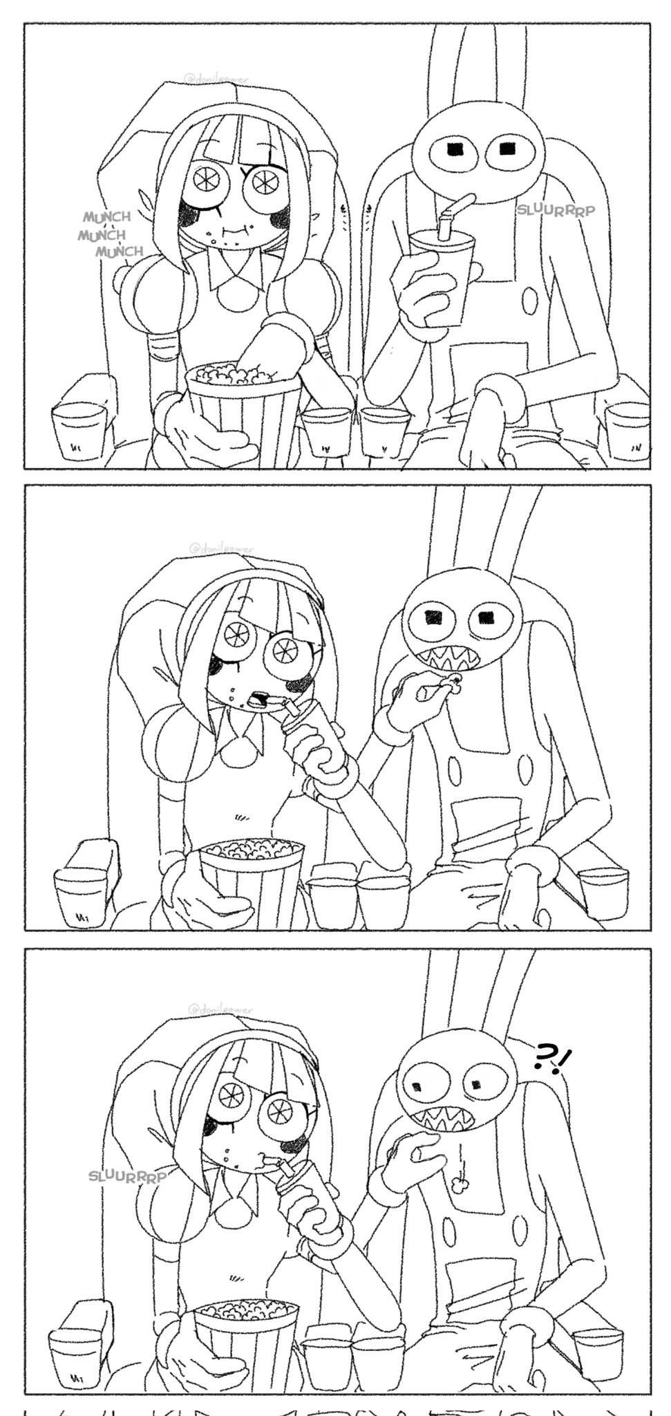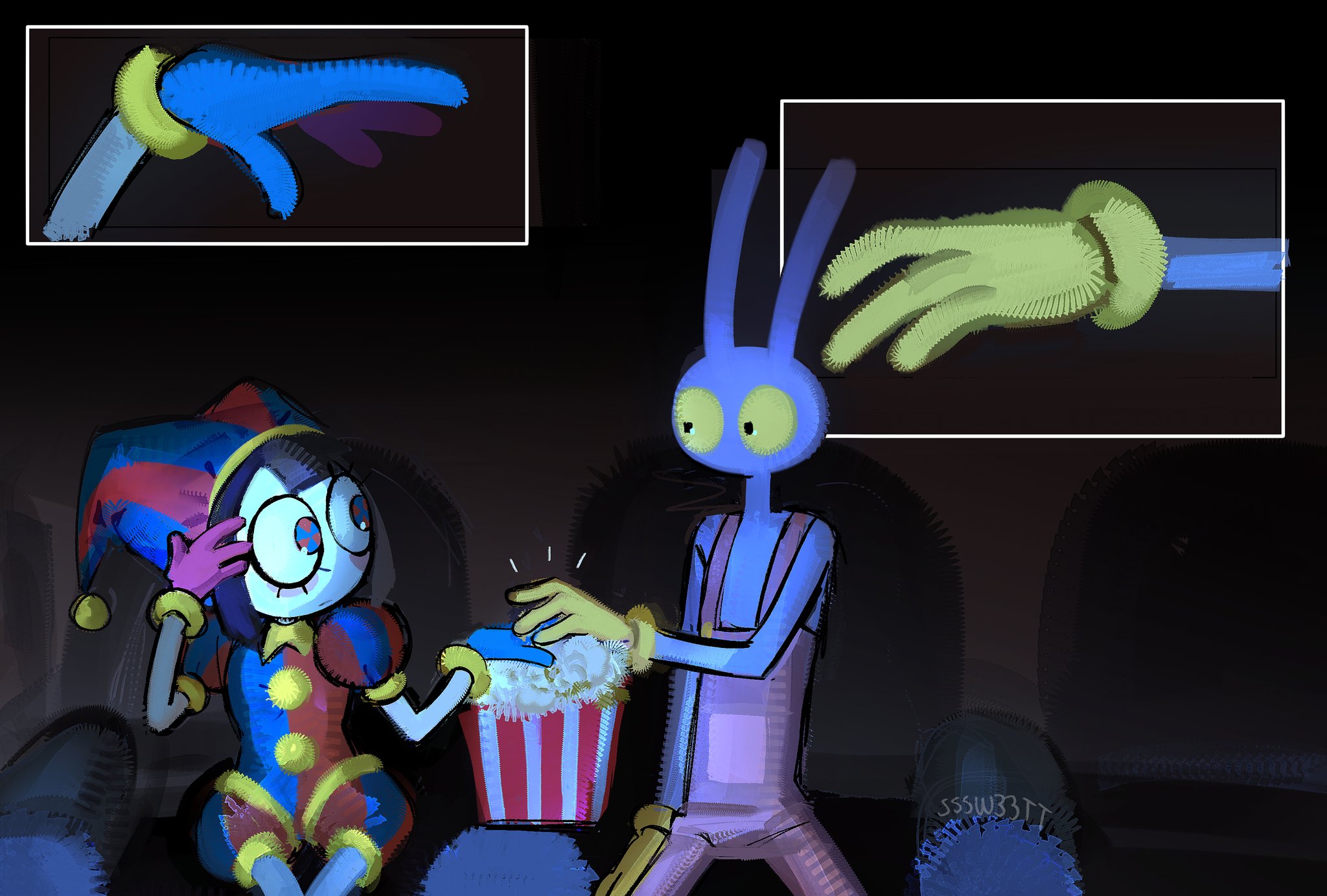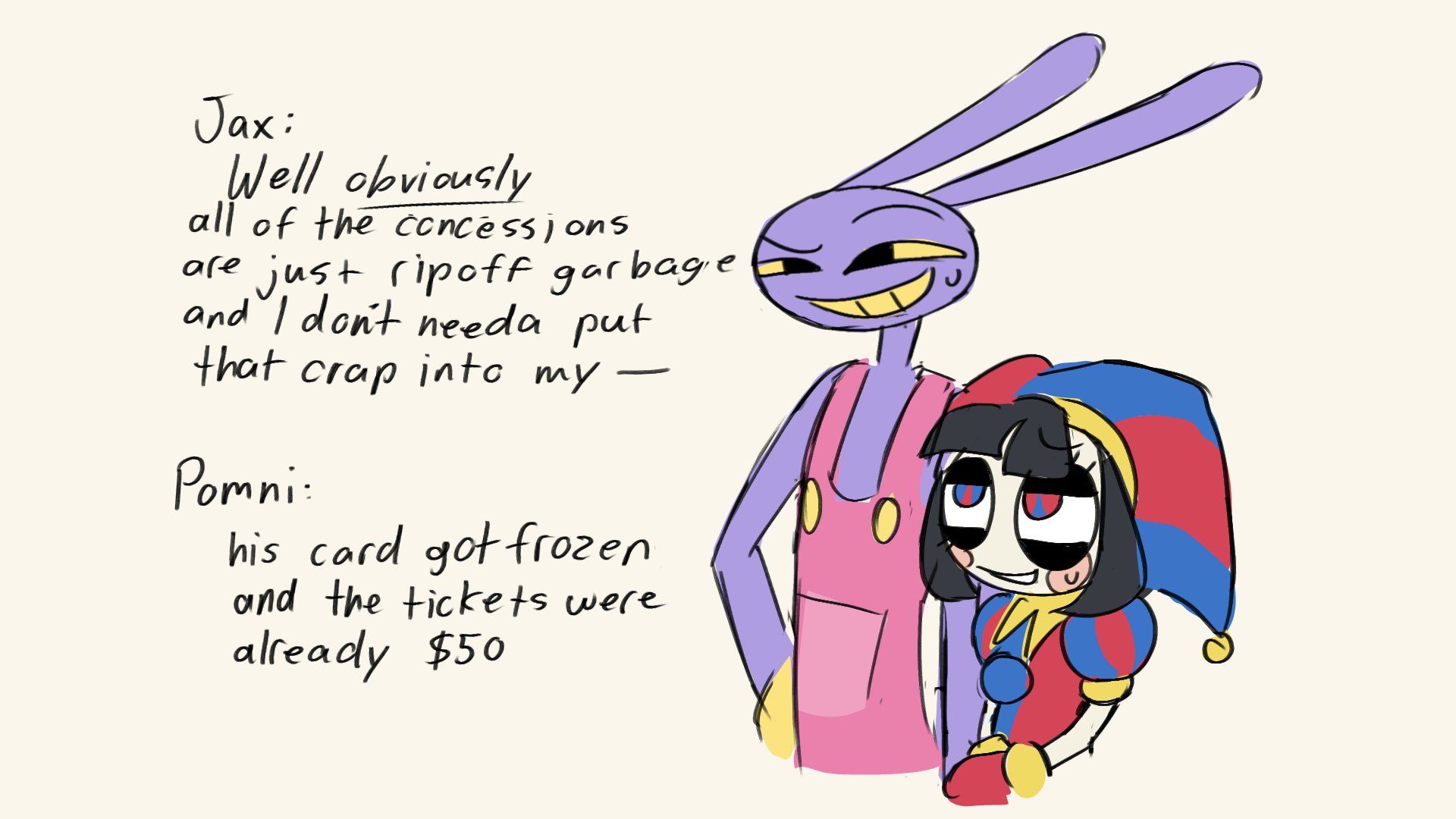 Jax would never share anything he would also make poor pomni go back and forth to get him more soda and she would miss the entire movie