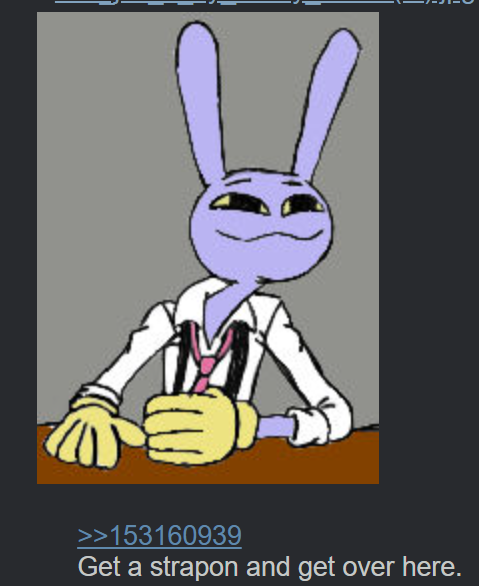 >>153232142>big titty rabbit that bullies you but secretly caresJaxfags i might have misjudged you