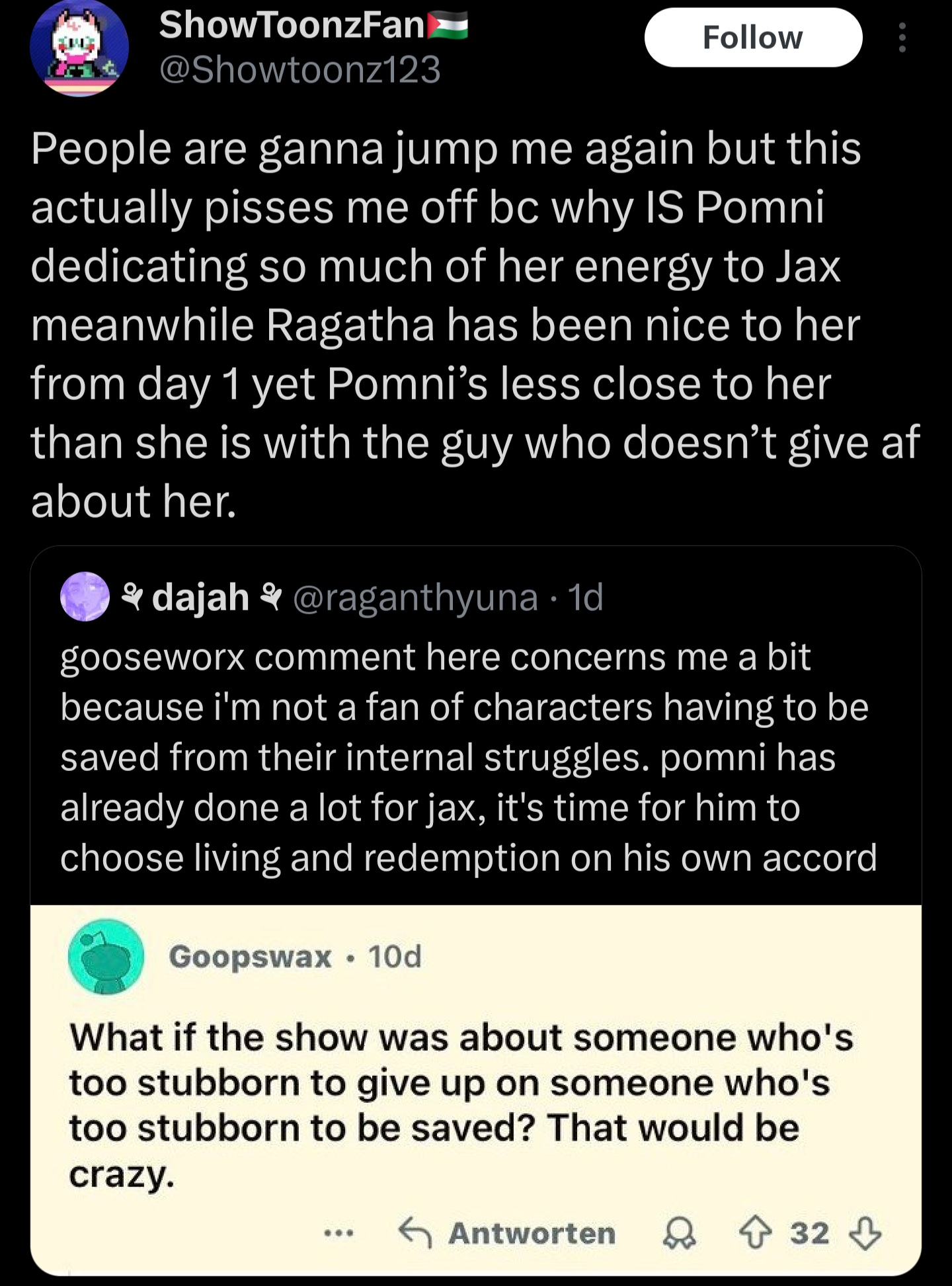 Pomni could forcibly transition Jax while burning Kinger for racial treachery and I'd still love her.