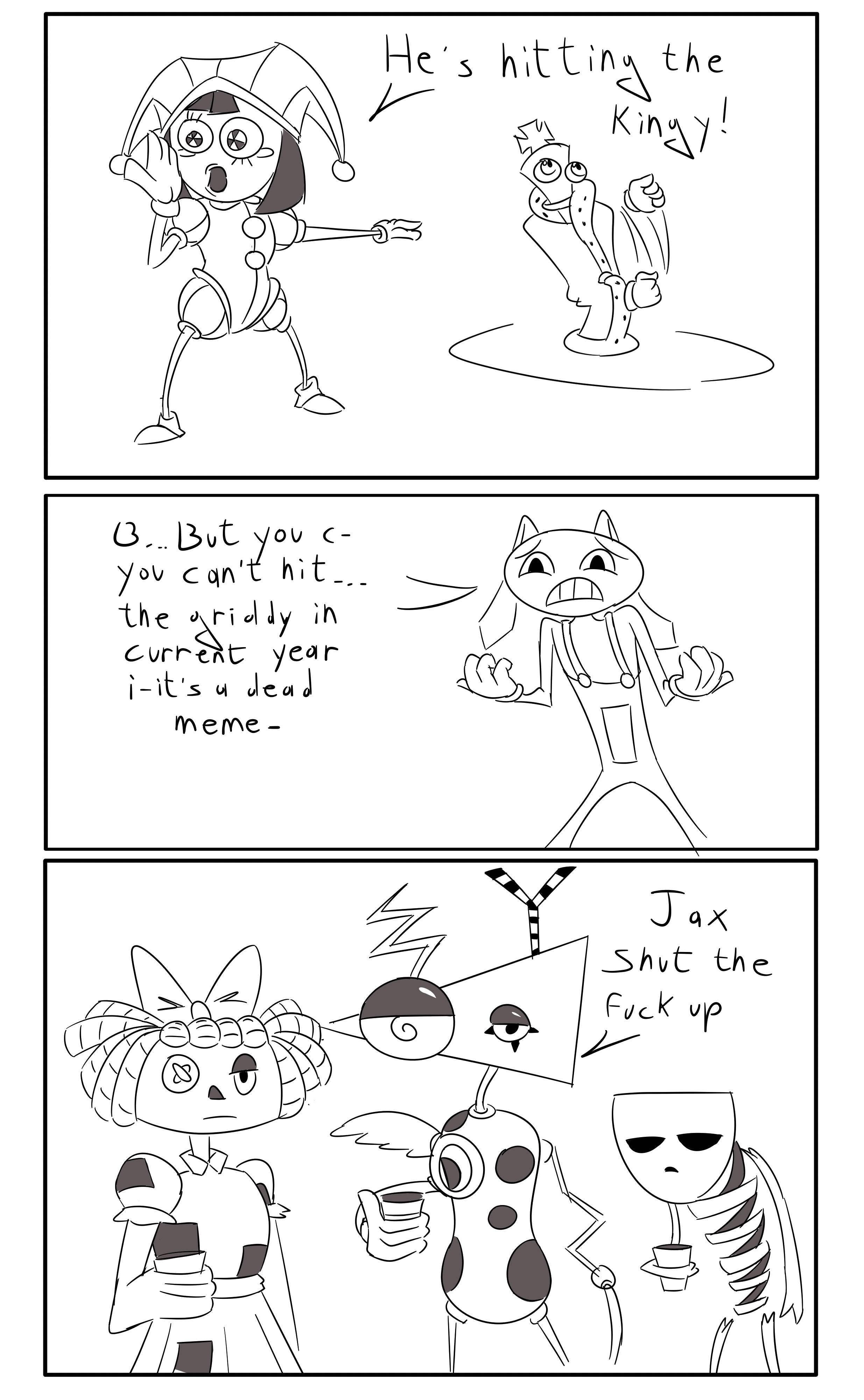 Making a prediction. The first scene in episode 9 is a rapid escalation of Jax blaming Pomni, Pomni being ashamed, Ragatha falling in despair, Zooble being in disbelieve. What then de-escalates it is Kinger telling everyone to stfu, taking the blame for both killing and creating Caine.