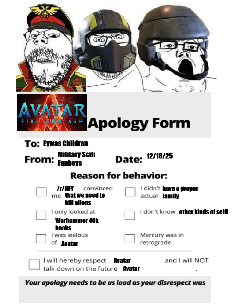 >>153236447Even if not an Avatar fan, I always commend alien focused media and especially making HFY dorks seethe. Honestly I wish had more alien focused stories or just stuff with alien leads that aren't just recoloured humans, Shakara is pretty good for that and District 9 is also pretty solid.