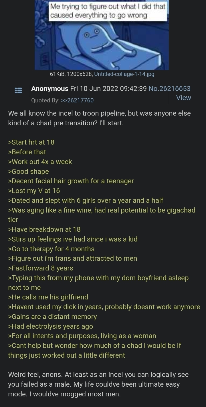 >>153252818Potential Man vs Potential Woman. Just like the troon in the picture, this is all about wasted potential.