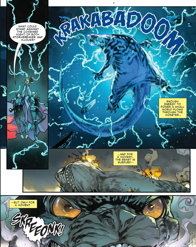 >the combined powers of thor and beta ray bill only produce enough energy to power a "small" world>this still knocks out a power cosmic-amped godzillaEmbarrassing for everybody involved