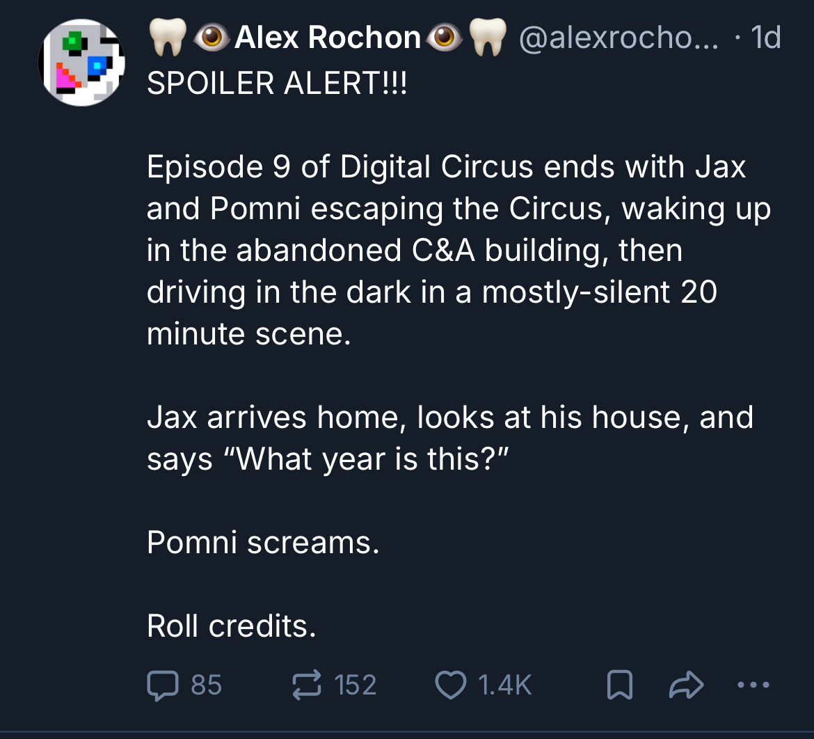 >residents can now manipulate the digital circus>caine's content filters are now disabledThe last episode is just one major orgy right?