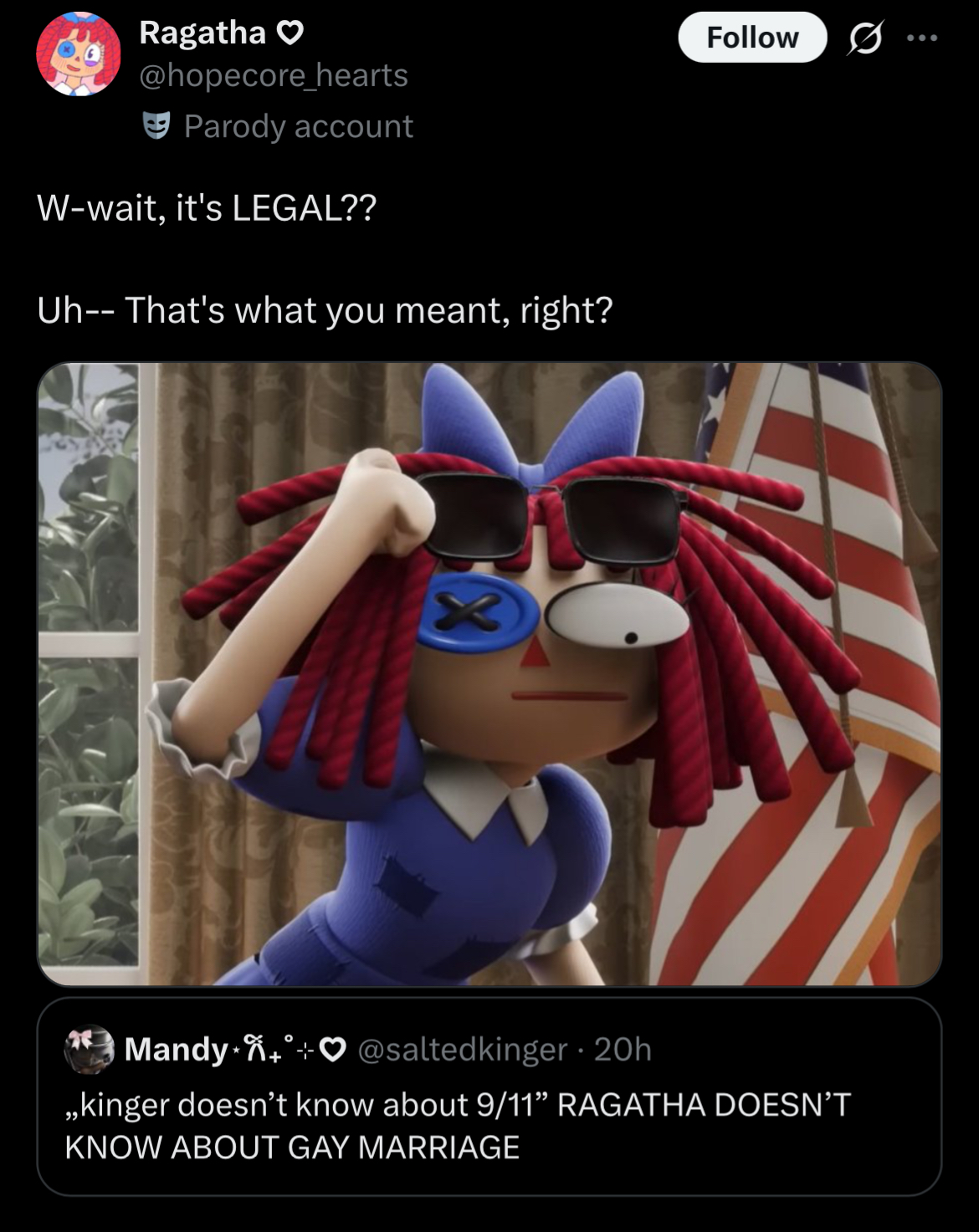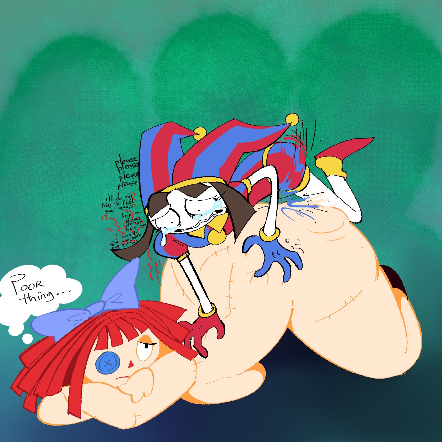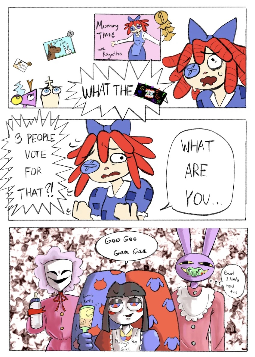 >>153254971I love Pomni a lot, even if I love Ragatha more I wouldn’t make this trade.That being said, if I’m to entertain the hypothetical, Ragatha as the protagonist would make for some interesting conflict. Putting her in Pomni’s bridge builder role, but with her people pleasing self-harm cycles, would make for an interesting dramatic conflict.