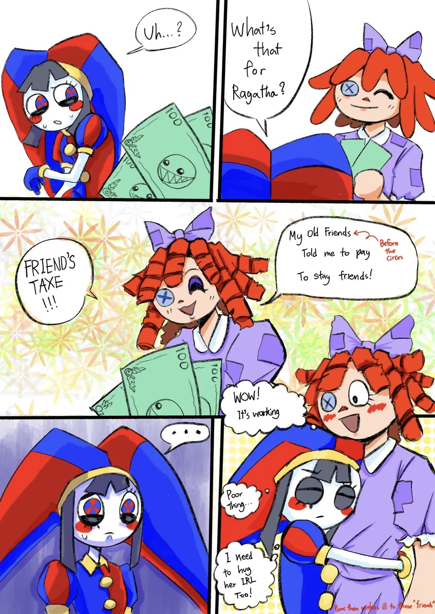 >>153252564Does anyone have that fan comic of pomni talking to ribbit's ghost in ep 4 before she disappears and Jax says something along the lines of "still gets on my nerves even when gone" or something I lost it and I wanna read it again