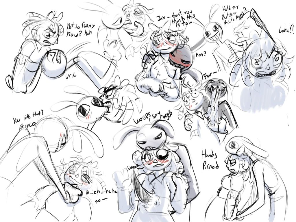 >>153255294>Jax reading the other character's journals about him>all of them are really sympathetic and feel sorry for him>even zooble doesn't really hate him>ragatha is jealous of his relationship with pomni>this relationships is news to Jax>Pomni's desire to snuggle in bed with Jax scared the fuck out of him