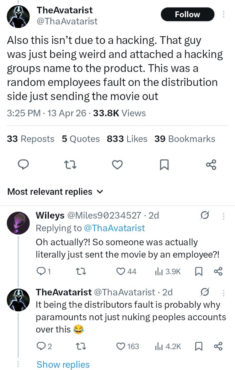 >>153256659>>153256686You don't "accidentally" email an entire movieThat shit was deliberate. Someone was mad pissed at David Ellison