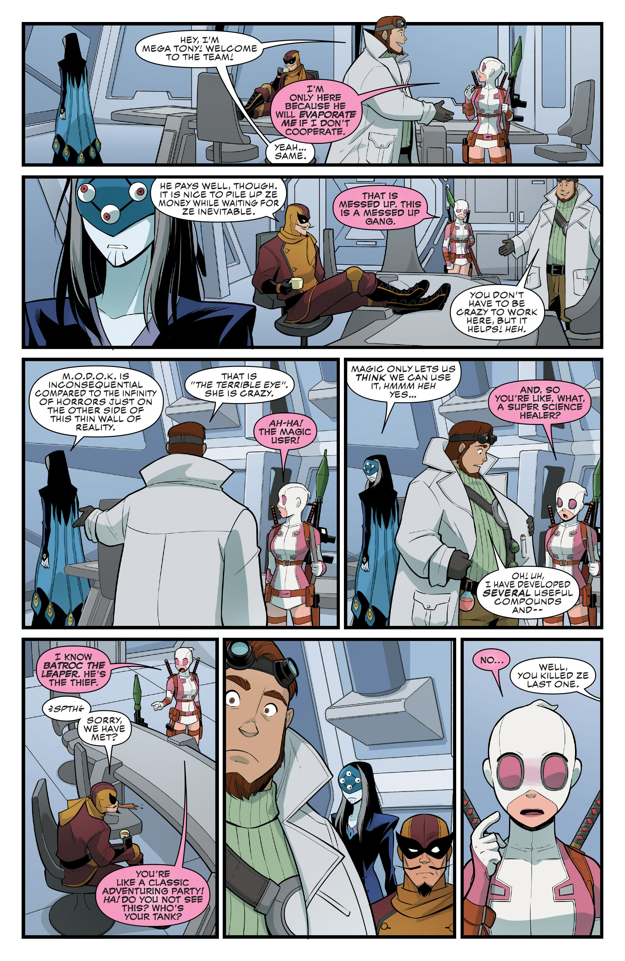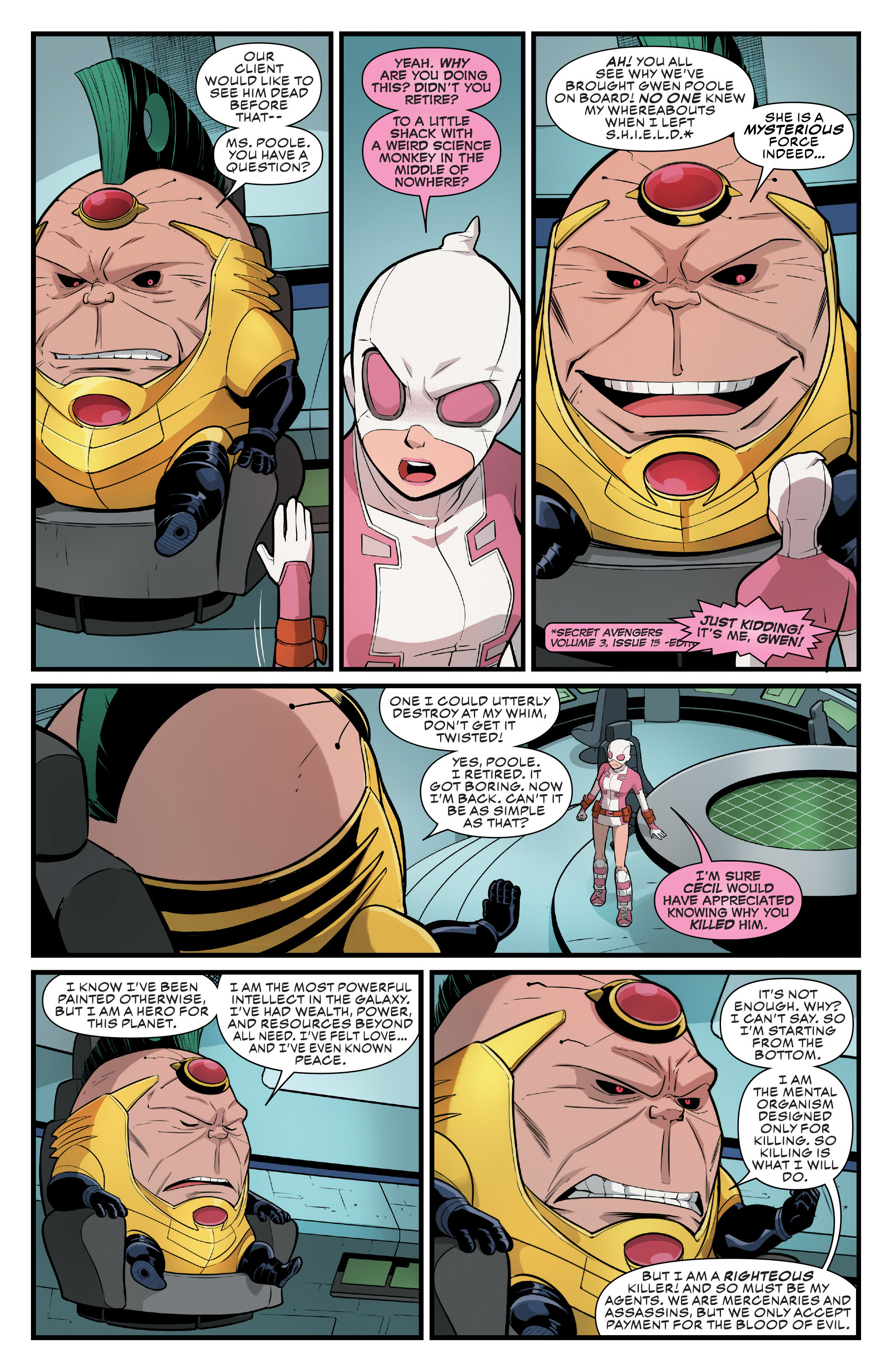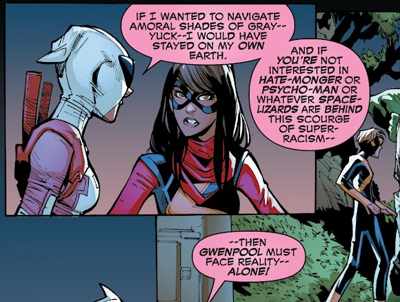 There's probably more instances I'm not remembering, but the point is Gwenpool would get critical at times, whether it be for story beats, tropes, or the industry as a whole. Marvel would never let her say anything TOO scathing I'm sure but it'd be a missed opportunity to not point out some elements, especially for a comic-book fan.