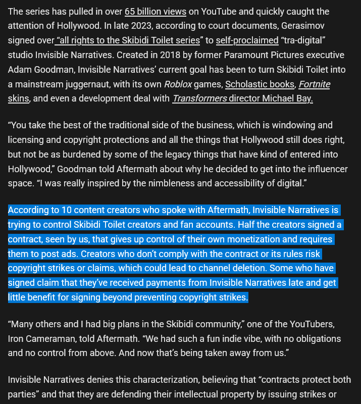 wait, so let me get this straight>Sold the movie rights>Movie rights prevent him from making new content >Because there's no new content, interest dies>Corp left holding the rights to a dead property and even if they release a movie, it's going to bomb because nobody cares about Skibidi Toilet anymoredid I get this right?