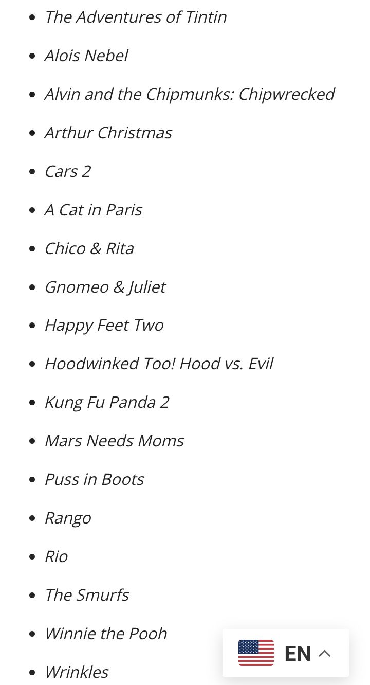 >>153274218>Cars 2Alright.>KFP2Alright.>Puss in BootsNot bad either.>RangoGreat film.>RioDogshit.>SmurfsDogshit.>>153274305>BoltExcellent.>IgorBretty gud.>KFPBretty gud.>Wall-EGreat film.