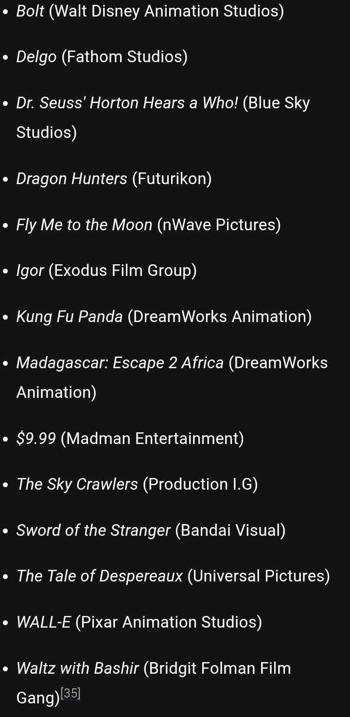 >>153272791It dominated the other award shows consistently. Wall-e won the Oscar cause Disney money.
