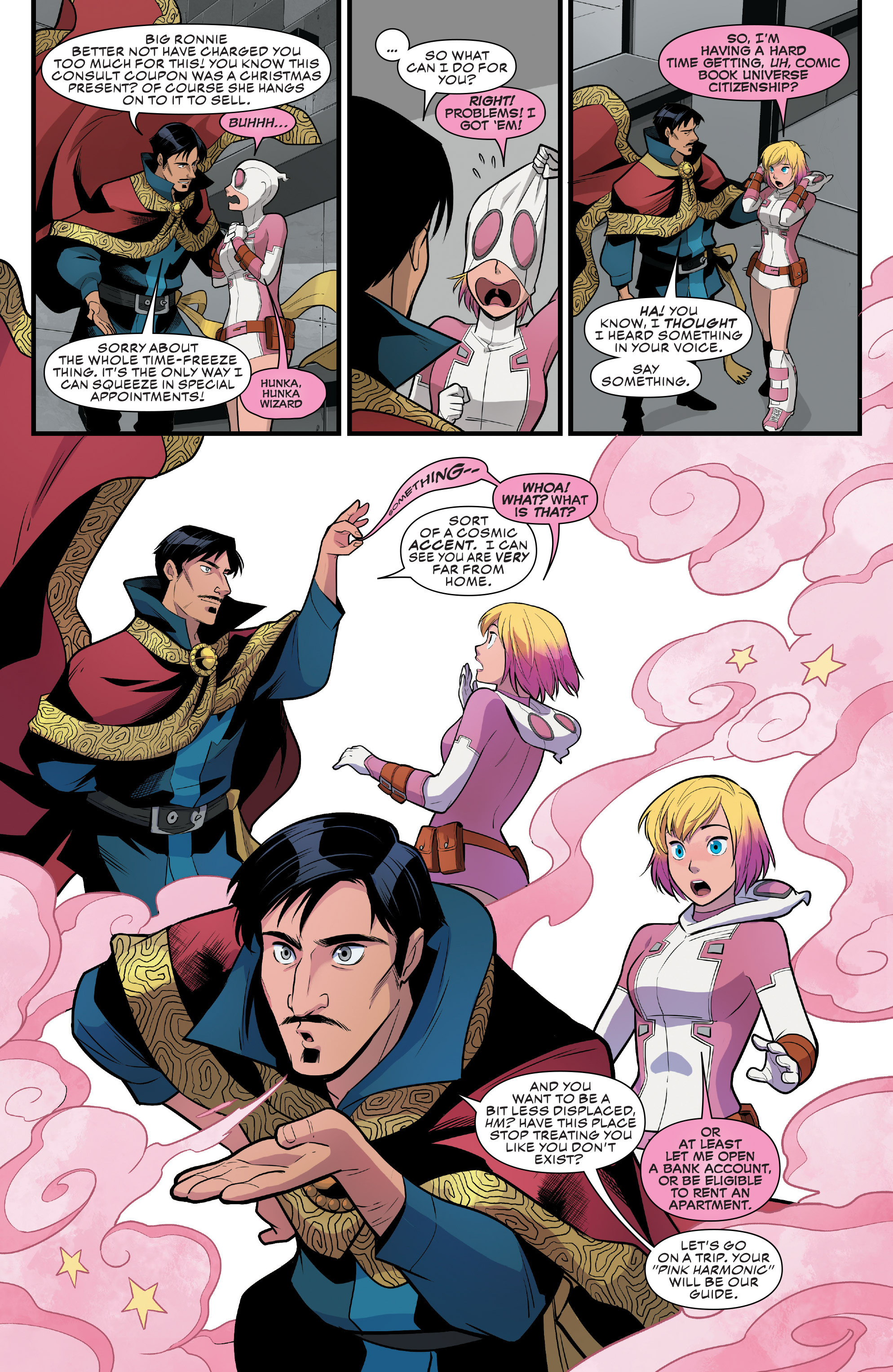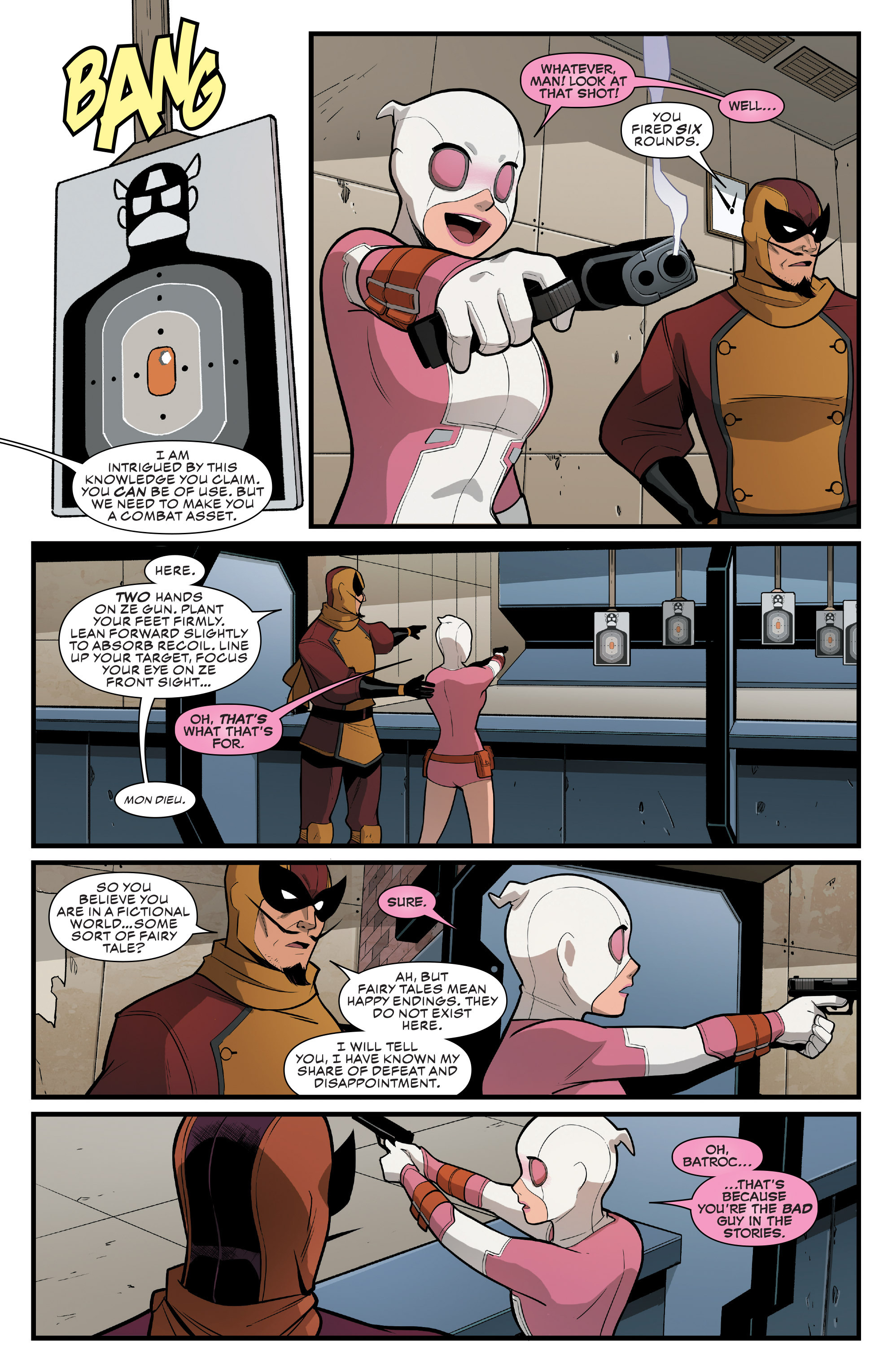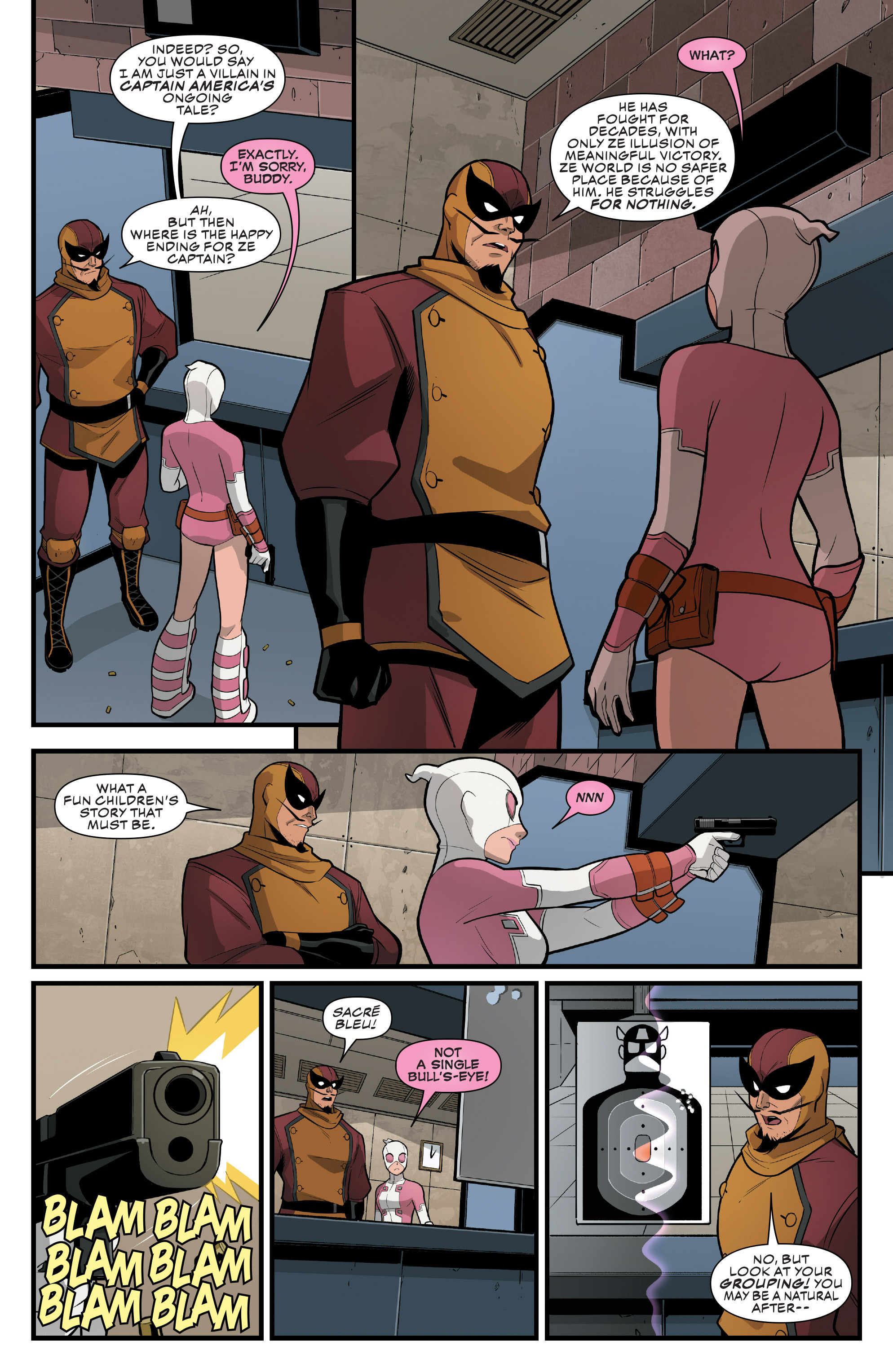 >>153272365One of my favorite covers from Unbelievable, it's shame the two couldn't come to an agreement>>153272382As I said before I like how Batroc is 100% willing to turn in Gwen for being a fraud, not immediately sympathetic, and Gwen has to convince him to give her a chance with her meta-knowledge. It feels more earned this way. I feel like Batroc still isn't completely convinced she isn't crazy but it's just enough to pique his curiosity and not tattle on her.>>153272421M.O.D.O.K. is a bad person but a good boss, very responsible making sure everything is on record for bookkeeping.>>153272438Love Ronnie looking out for Gwen early on. She's still stern/making Gwen work for her money but I think she gets how Gwen's in over her head and offers help in ways only she can. Also in retrospect I imagine she feels somewhat responsible given, as she herself said, is enabling Gwen since the start by putting her costume on her.>>153272470M.O.D.O.K. severely overestimating Gwen is funny>>153272488Batroc coming around to being the other one to help give Gwen the legs she needs to stand on in this world. I think it's a fair progression where he's intrigued enough by her powers but still wants her to at least be able to handle a gun and combat basics, which Gwen herself will come to appreciate in time.Also like how he is one of the first ones to buy into Gwen's belief she's in a comic book, it makes for some neat dialogue here about his role as the 'villain'. Given Batroc is the only character here (besides MODOK) with real history it makes sense to use him for this, and I like the introspection as to whether Captain America really has it any better as a hero in a never-ending struggle, which even Gwen seems to question>>153272514I like how Strange notes/interacts with Gwen's pink speech-bubbles. As Gwen would note later here her being an interdimensional immigrant it's cool to have the Sorcerer Supreme as a universal customs guy