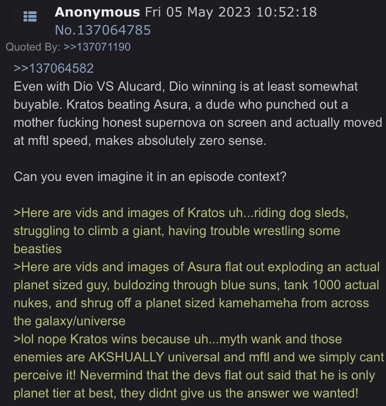It’s all ironic since every genuine Kratosfag left not too long after Krasura came out. Nobody here genuinely likes Krasura but it’s free (You)’s every single time somebody gets bored and wants some attention. The bait is improving somewhat since there’s a new bait of Chakravartin chucking large fireballs at Asura alongside planets apparently. It’s still a rehash of the same thing nonetheless. I mean look at this >>153274790. Krasura is a comedy goldmine.