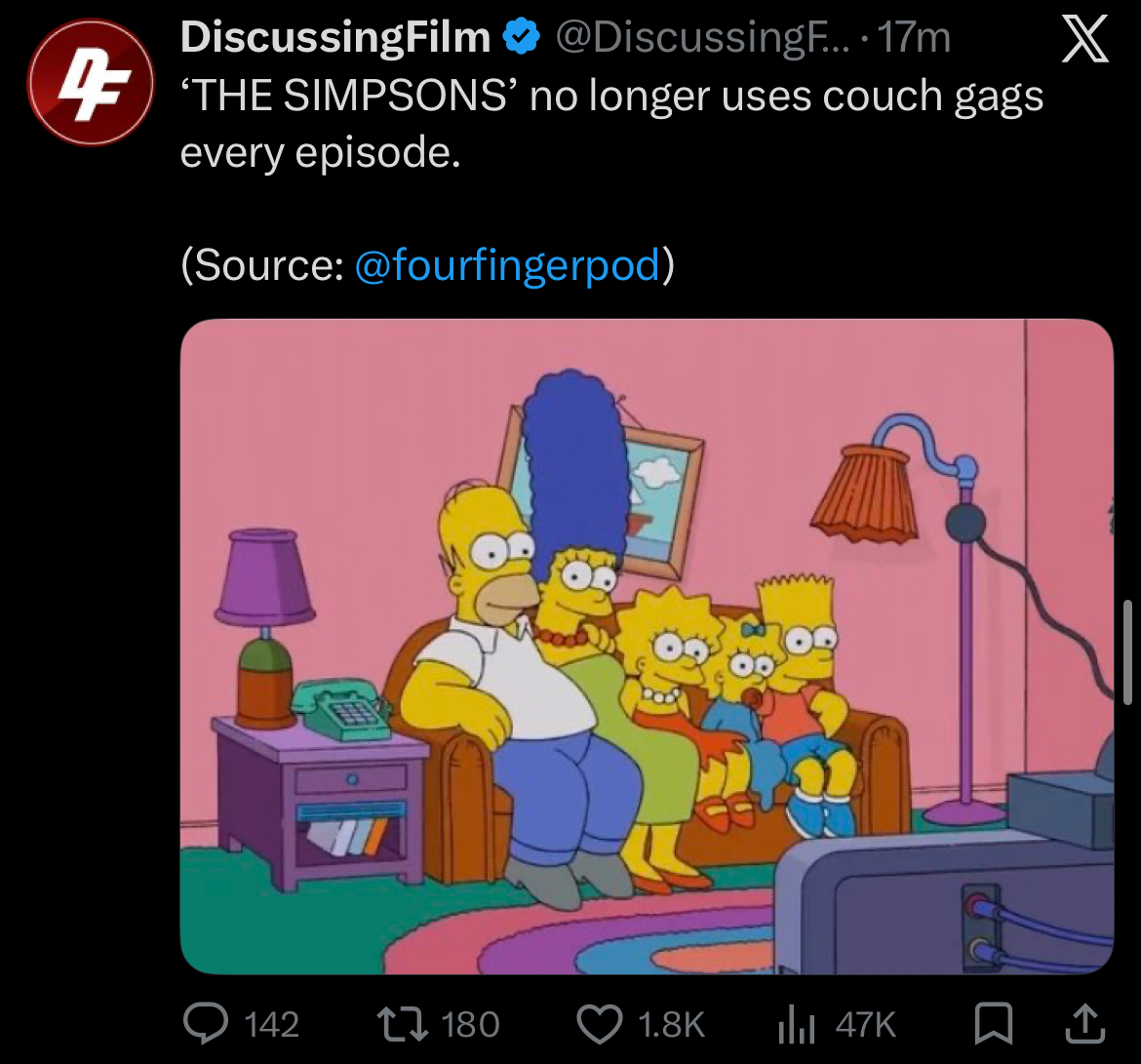 >>153278534This isn't anything new. Simpsons has been omitting couch gags when an episode runs too long for YEARS now. DiscussingFilm is just desperate for clickbait, as always.