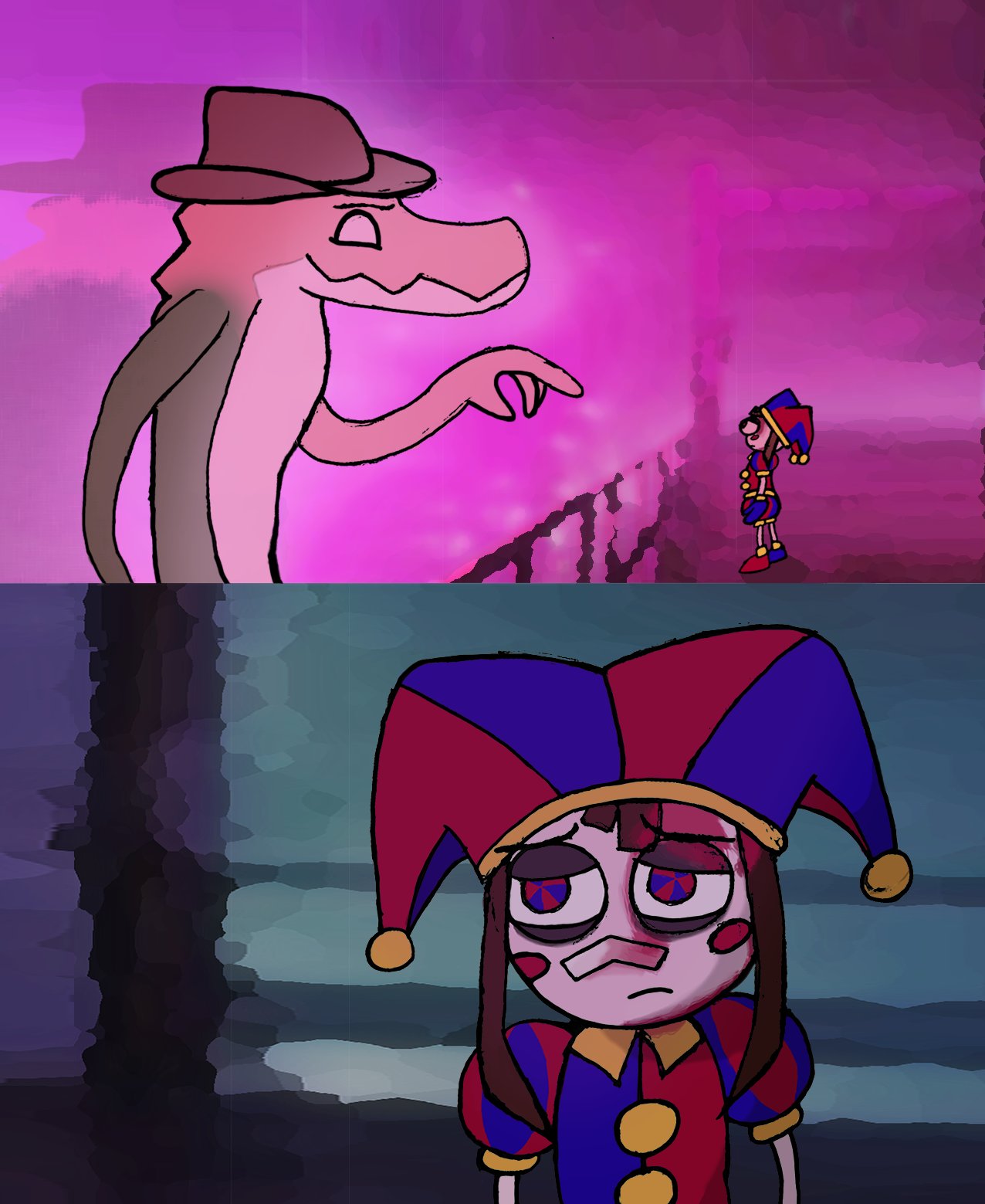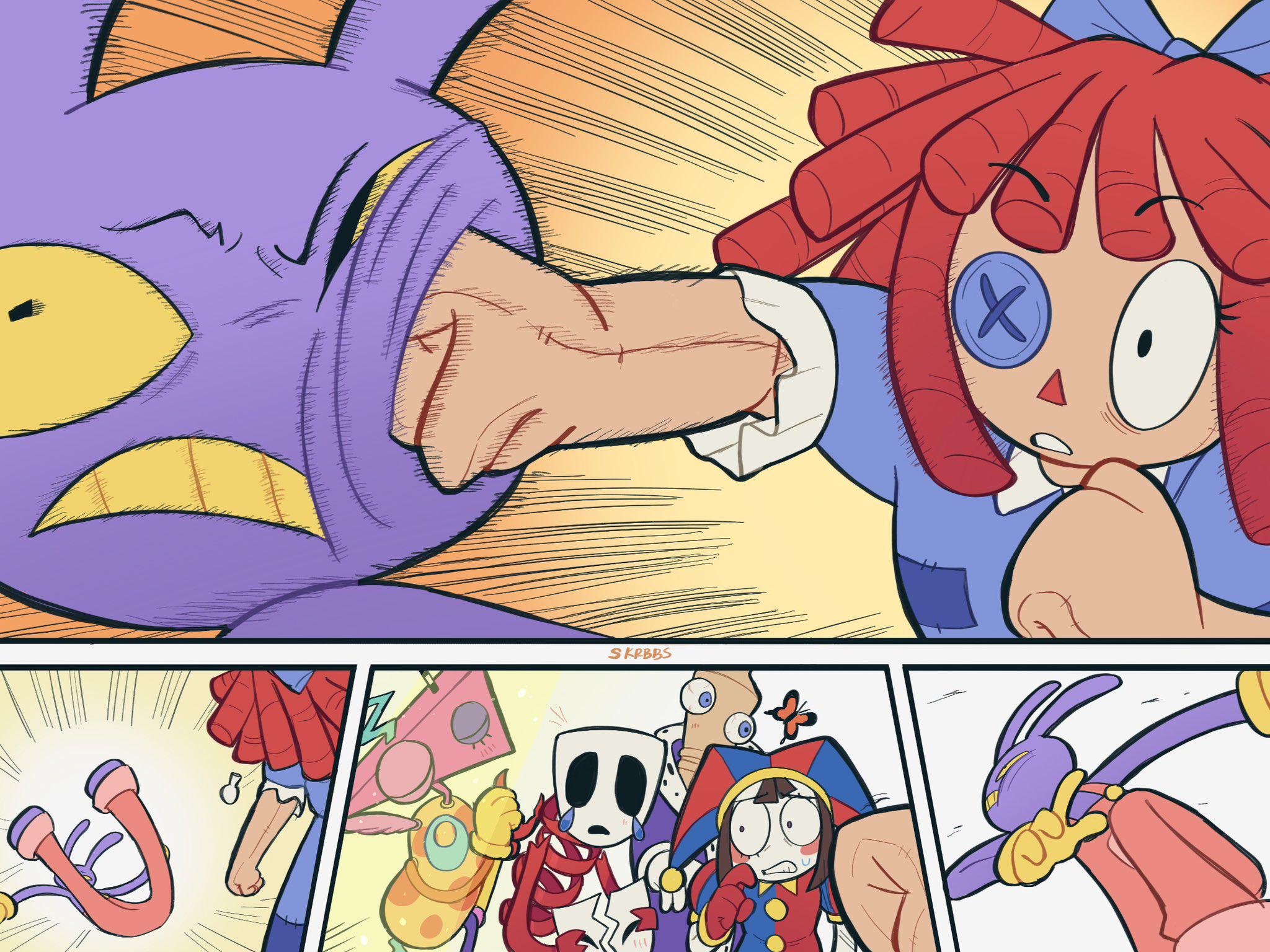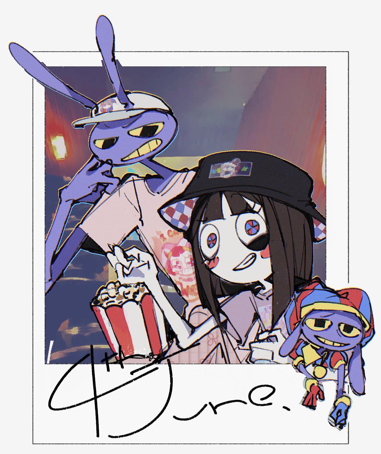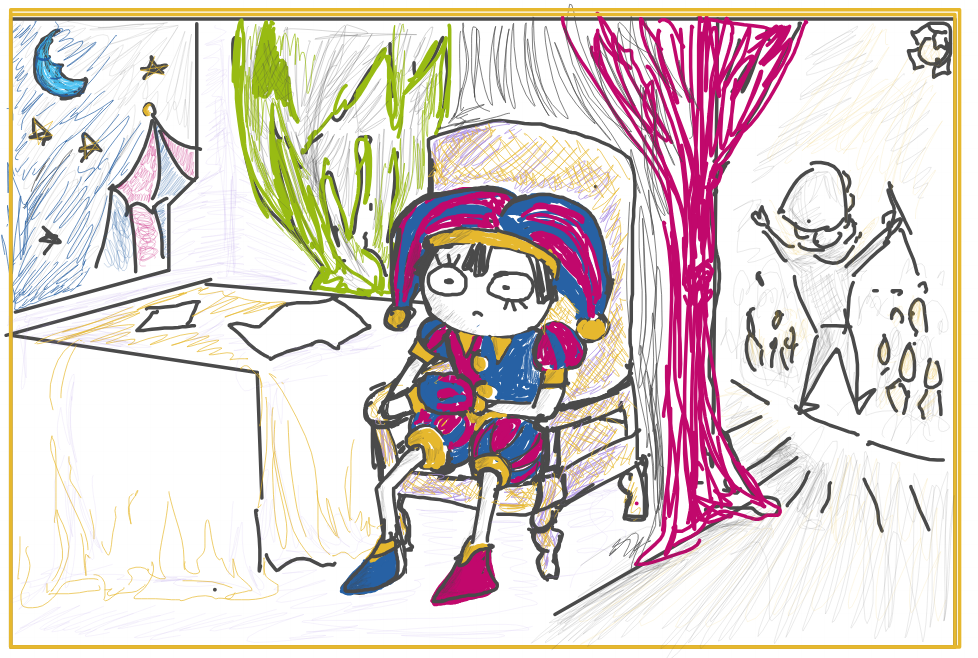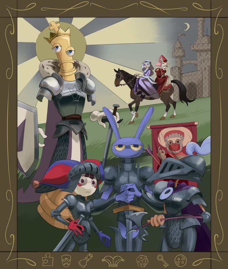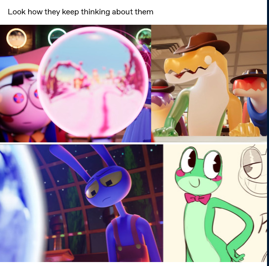 >Main characters: Jax, Kinger, Caine, Gummigoo>Goose's self-insert: Pomni>Exposition fairy: Ragatha>Background characters: Gangle, Zooble
