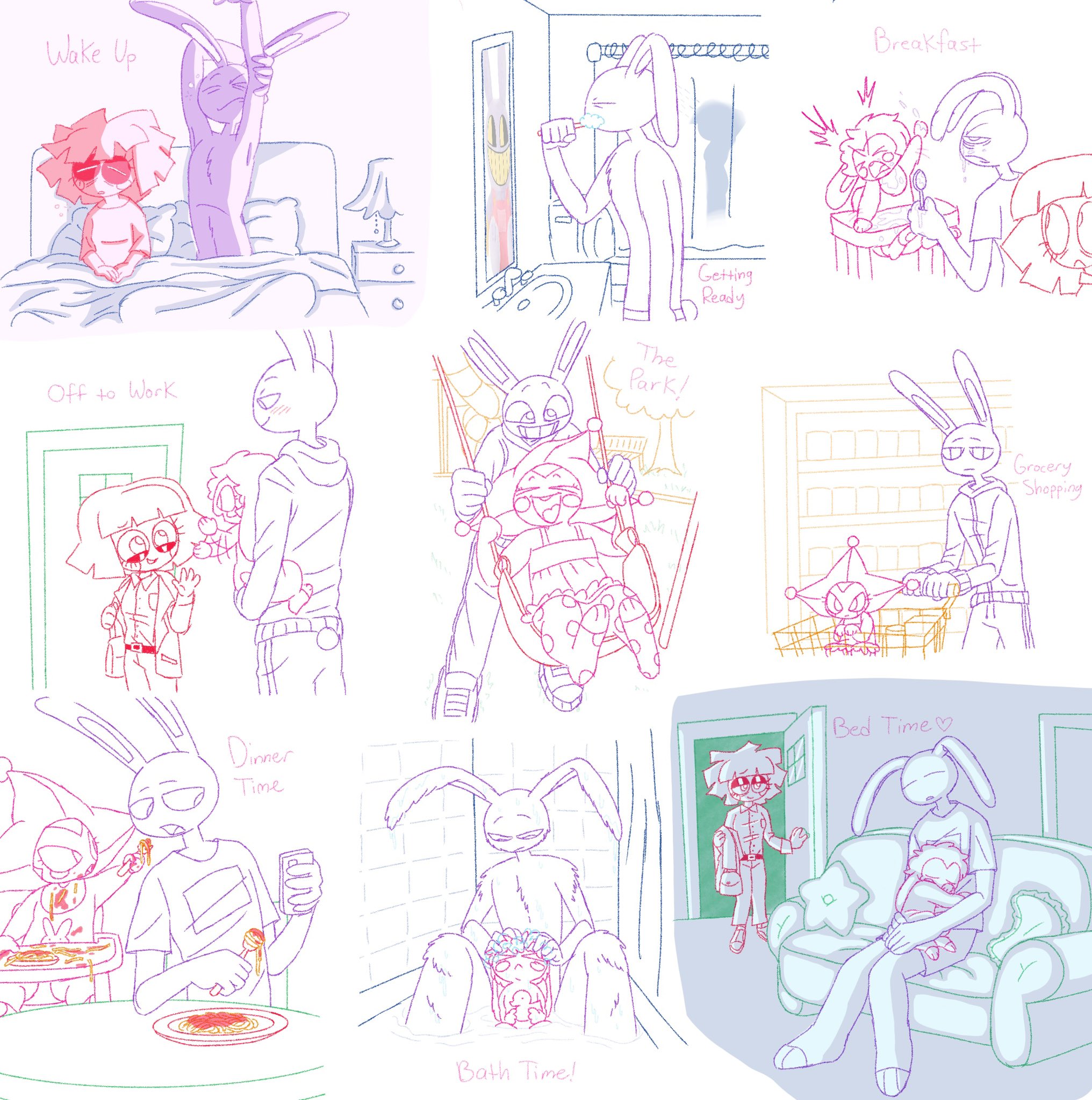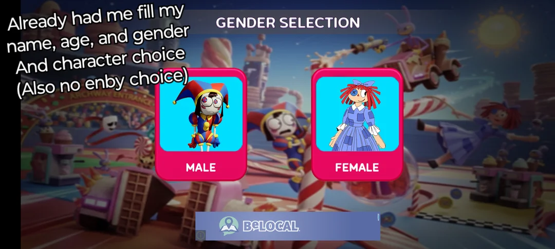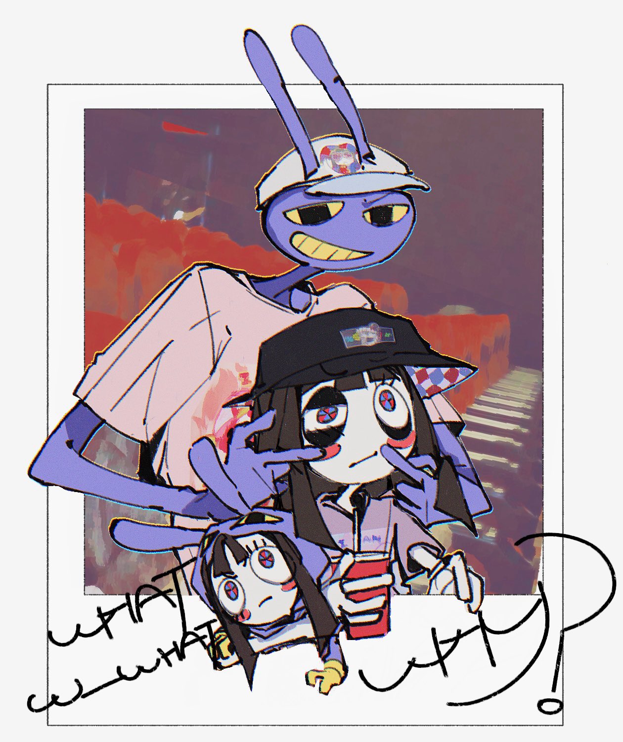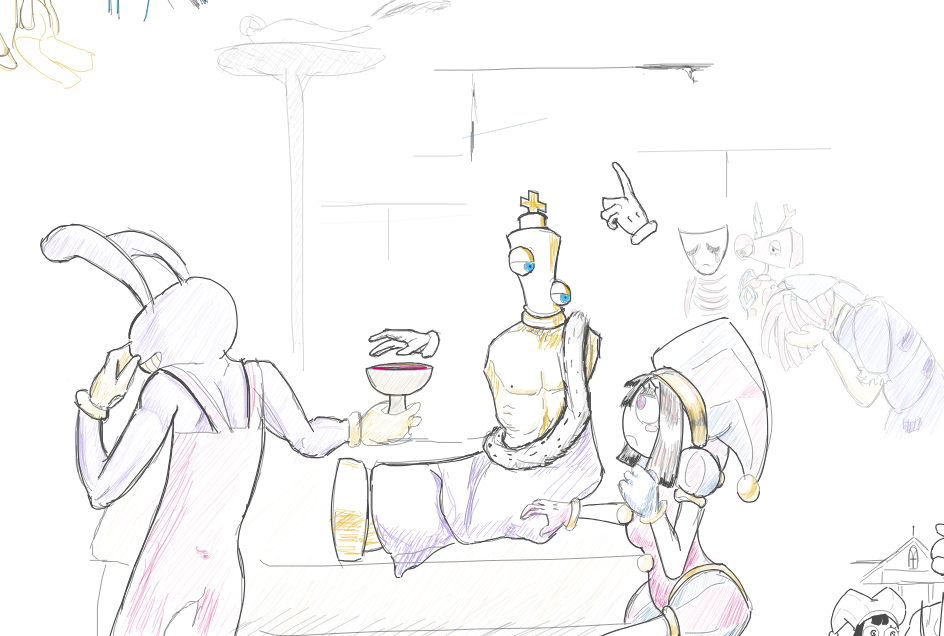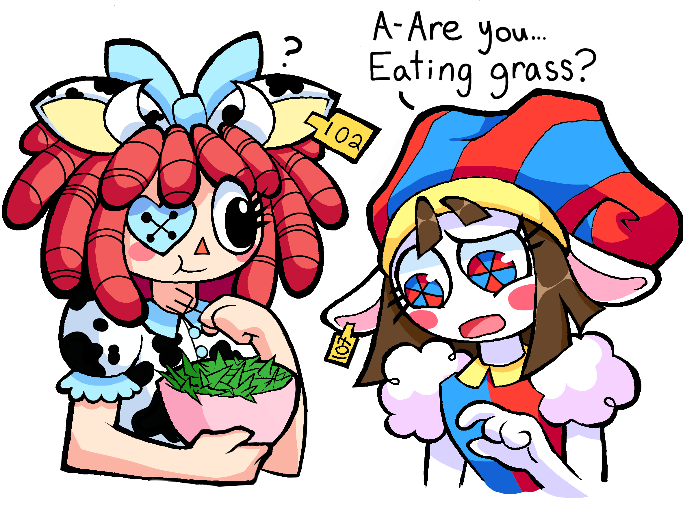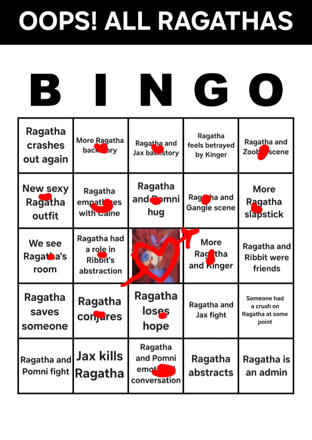 >Main characters: Jax, Kinger, Caine, Gummigoo>Goose's self-insert: Pomni>Exposition fairy: Ragatha>Background characters: Gangle, Zooble