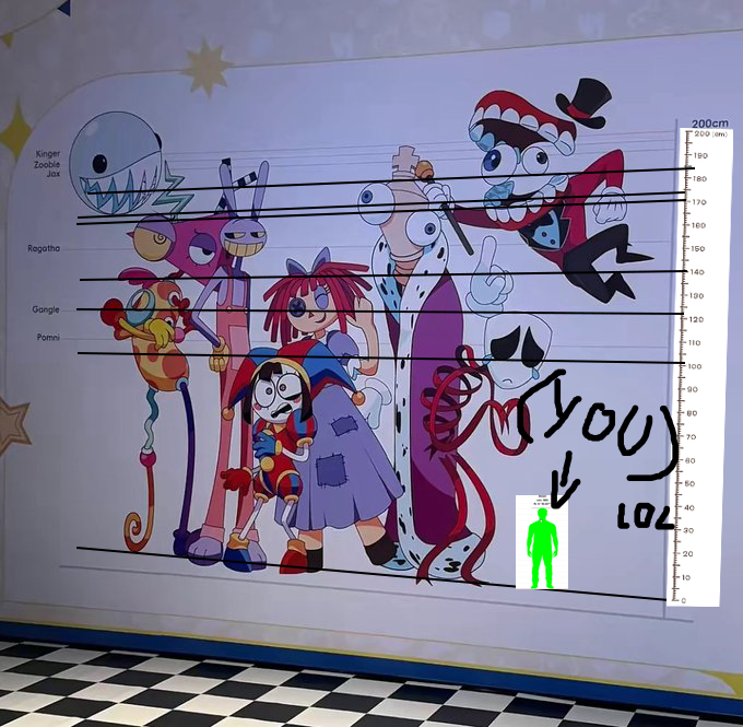 >>153284222Too much autism, but I grabbed the size chart from another post and more or less used a size comparator to determine your size with the rest of the cast, using the 25ft tall Jax (no ears) as referenceAnon you are a fucking pipsqueak, you are gonna have to be carried everywhere by Rags or Pom, or risk getting trampled.