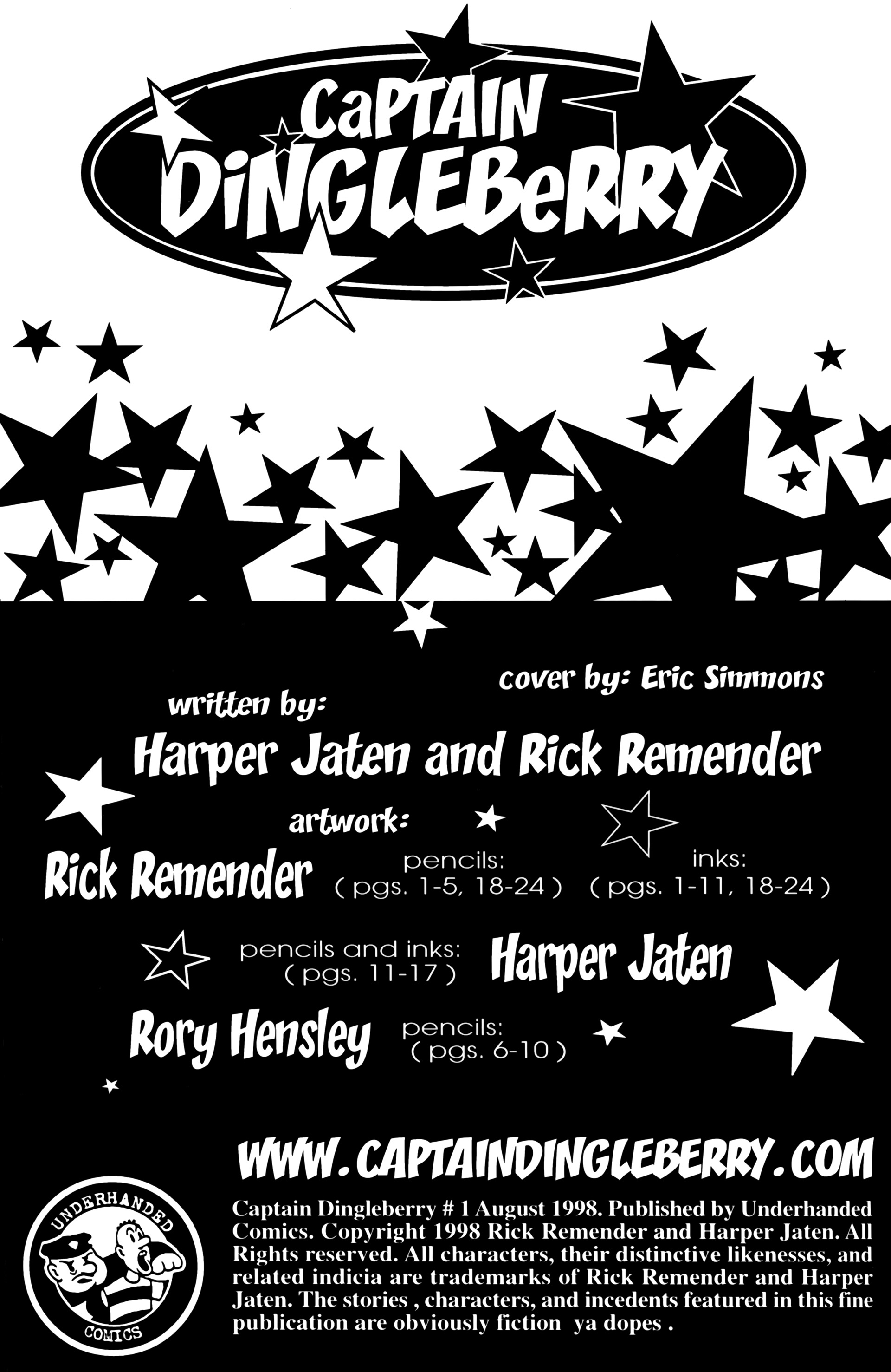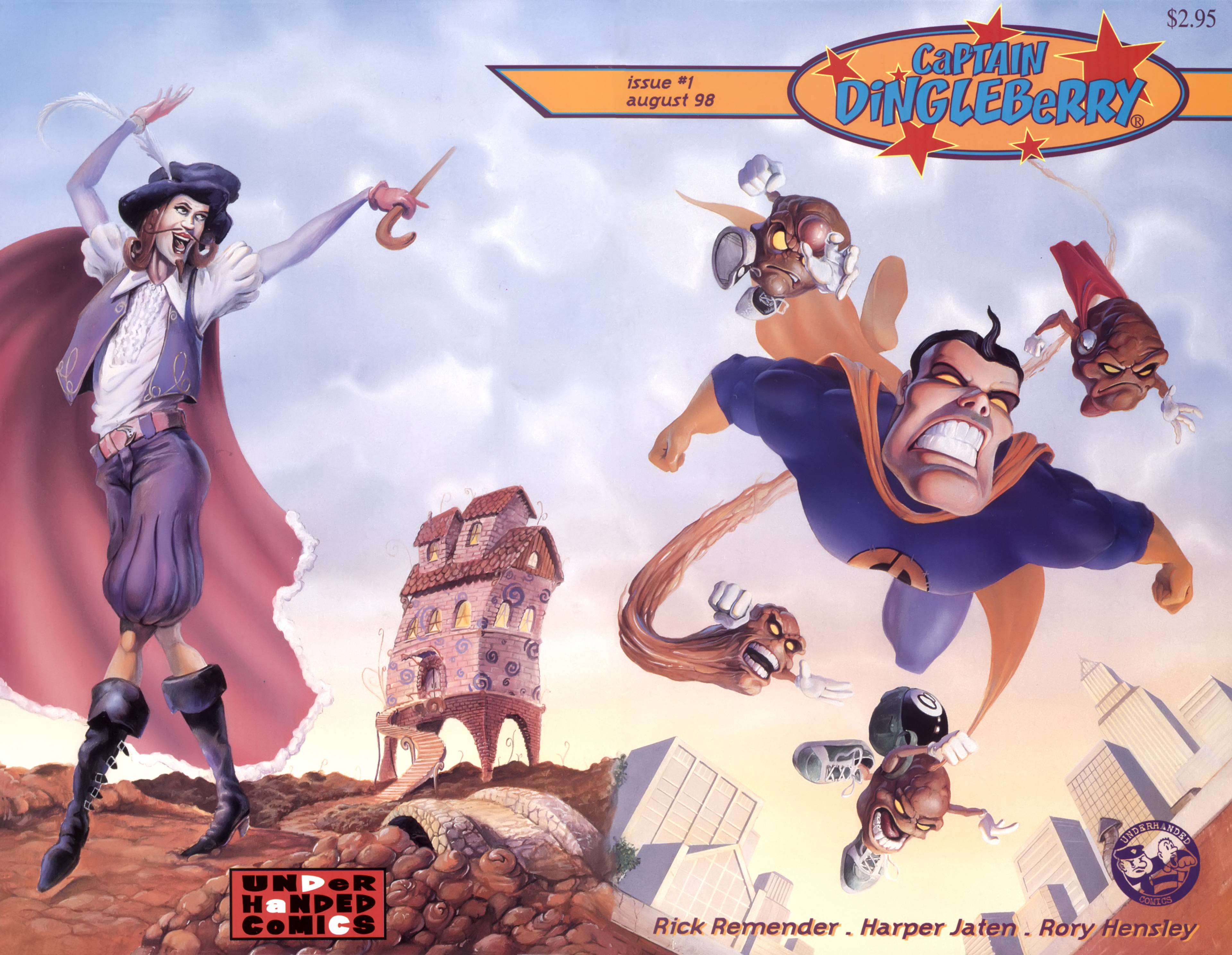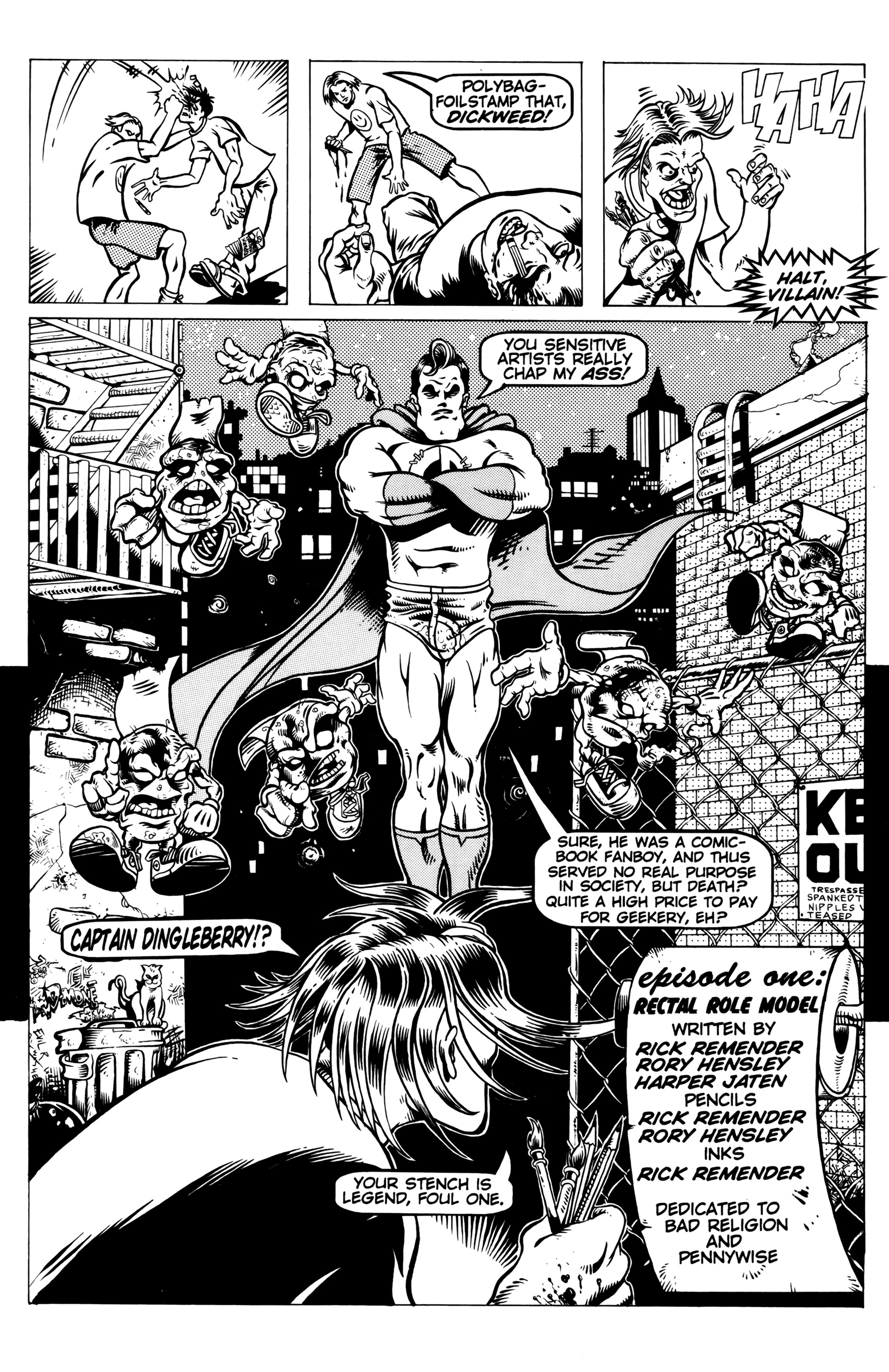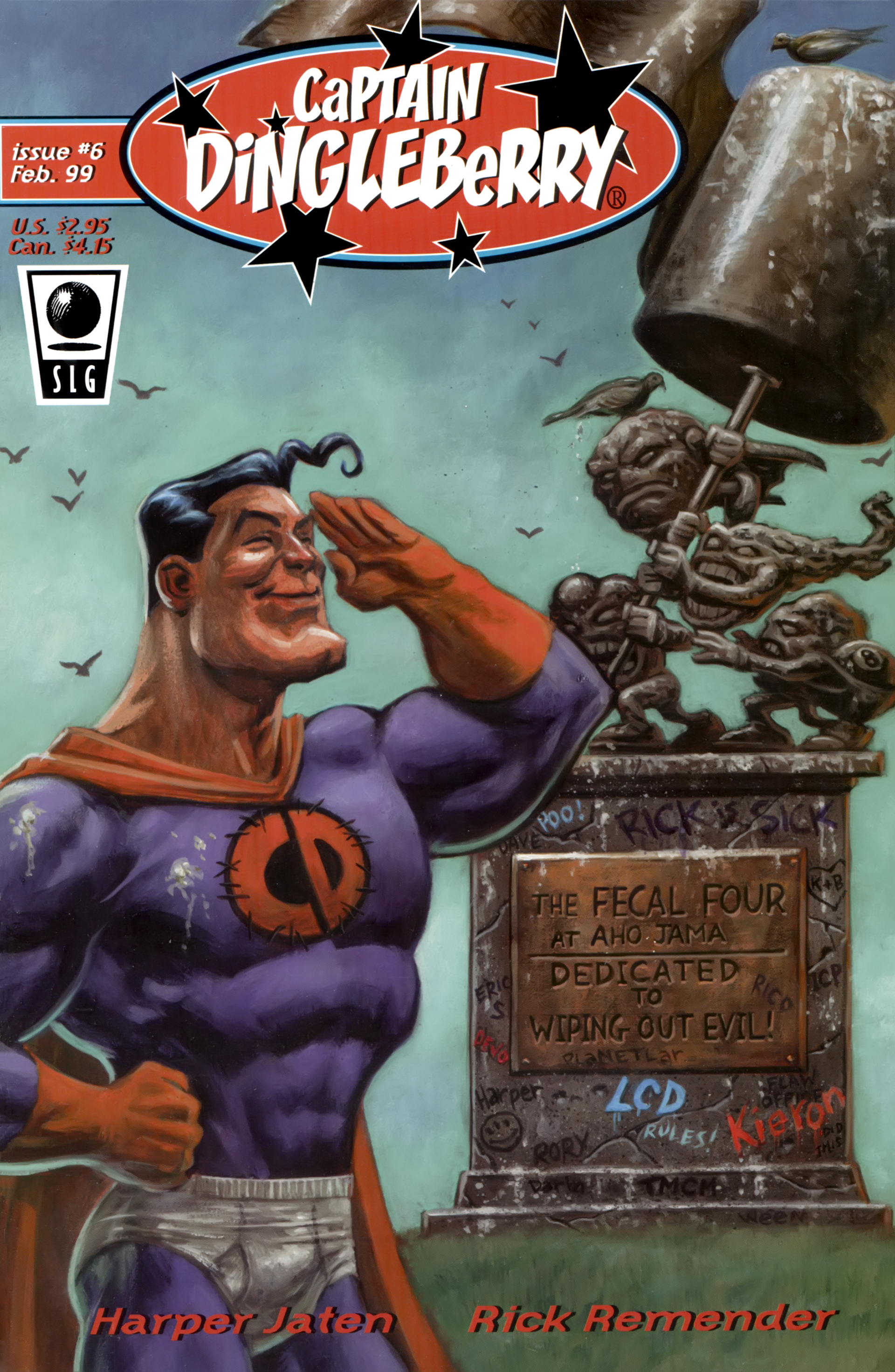 >Ah the smell of sweet justice! Caution evil-doers, Captain Dingleberry is here! Tasty art, a great adventure/comedy story, and unbelievable characters what else could you want. So drop your latest issue of Blood Blade Claw Force˛ (or whatever), and come try a happenin' heroic treat.In 1998, industry animators Rick Remender and Harper Jaten self-published a comic for four issues which would later be picked up by Slave Labor Graphics.Before Remender's Marvel work like Uncanny X-Force, Uncanny Avengers, Agent Venom, etc or his creator-owned work (which Jaten has been an editor on lately) like Black Science, Deadly Class, Low, Fear Agent, etc there was Captain DingleberryLord help us all