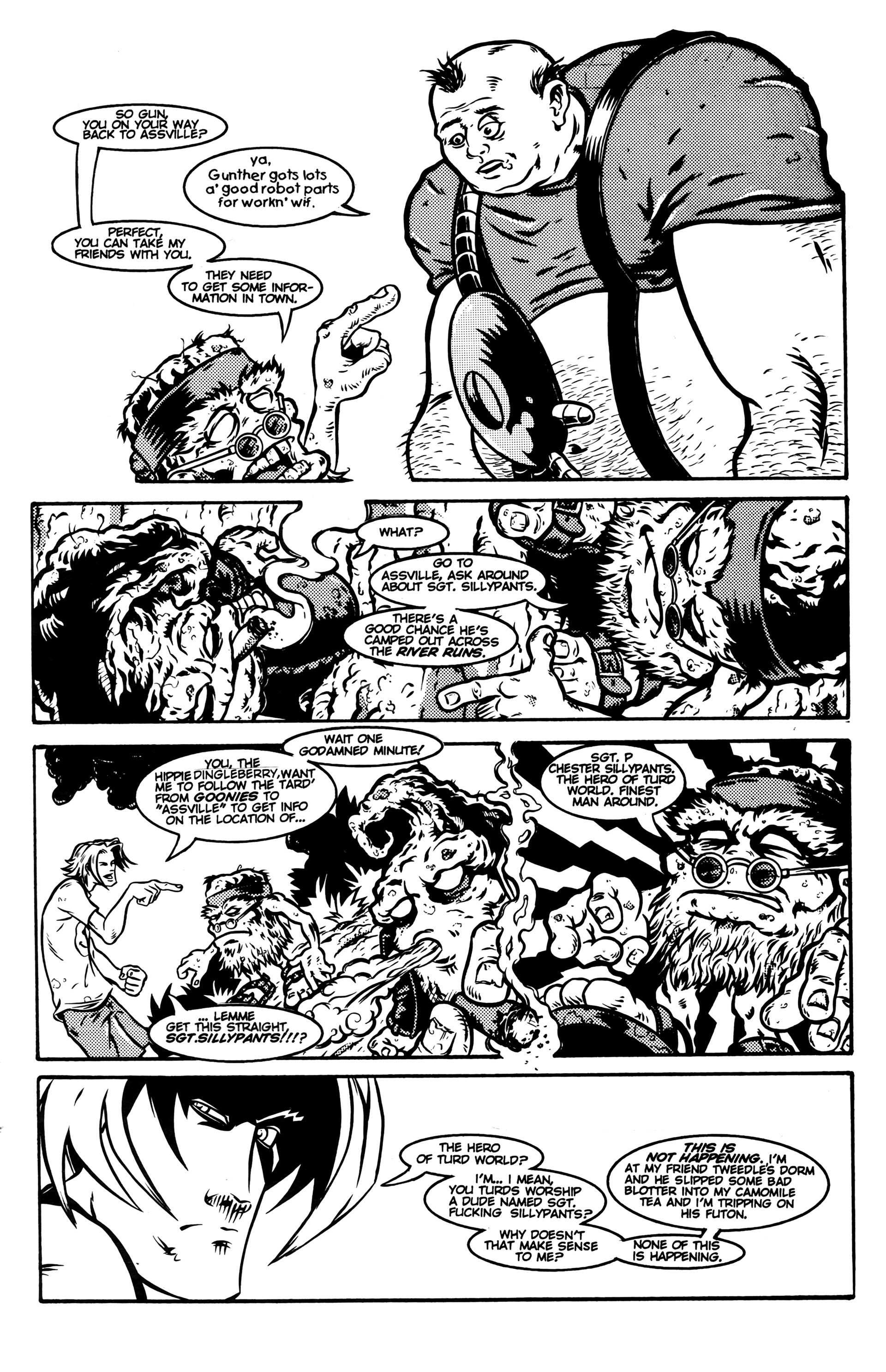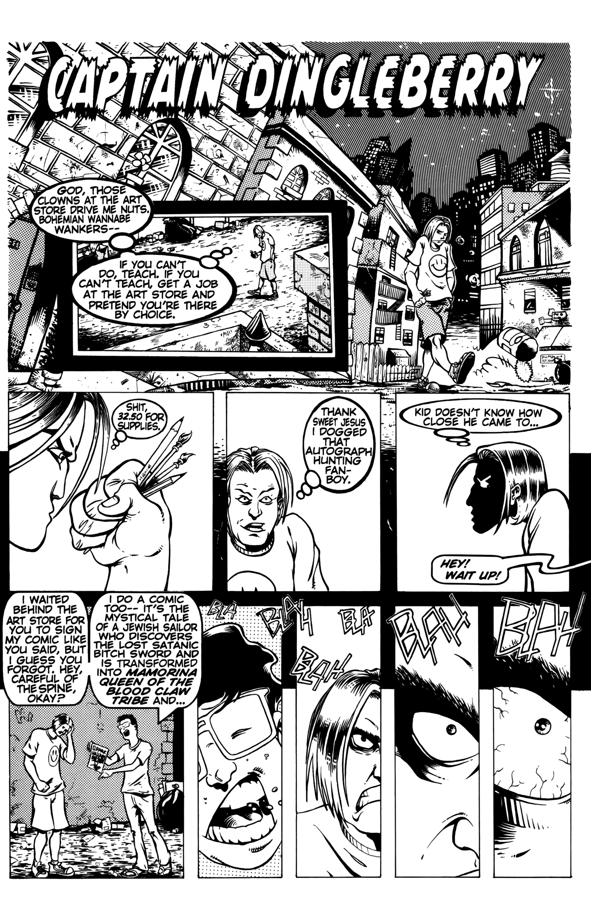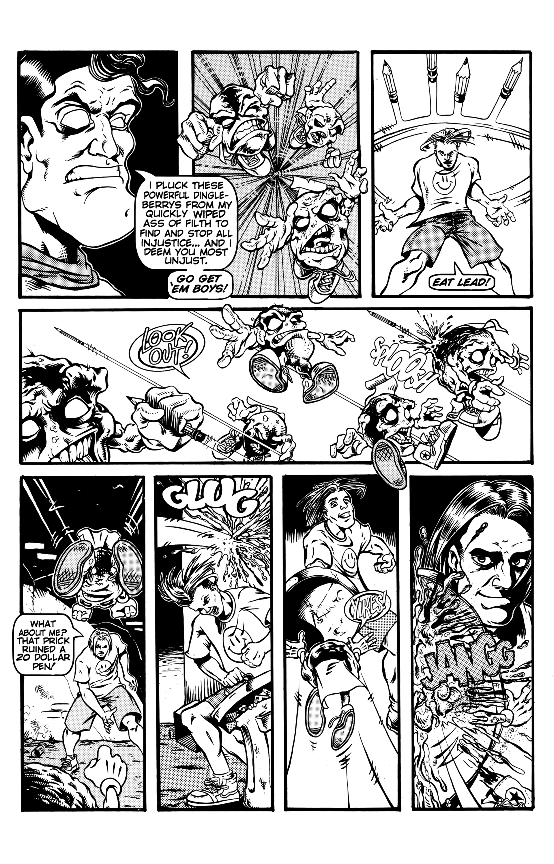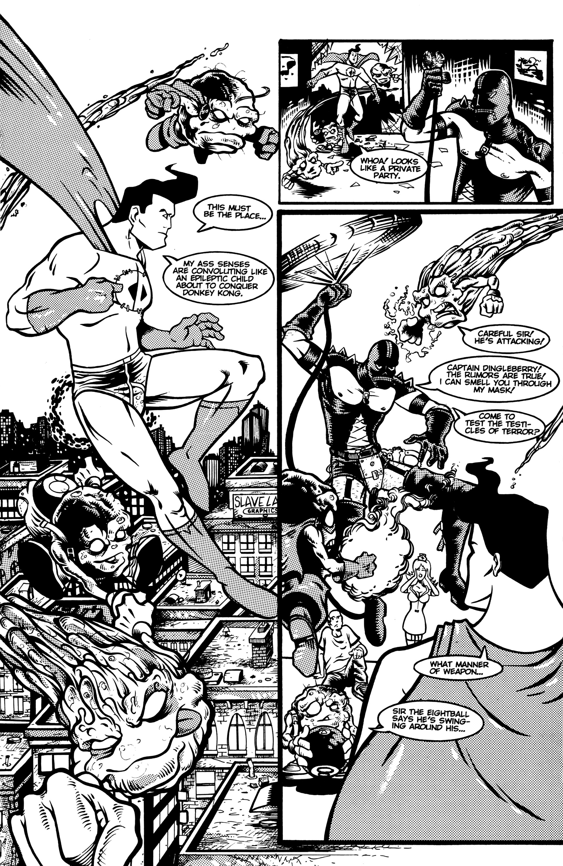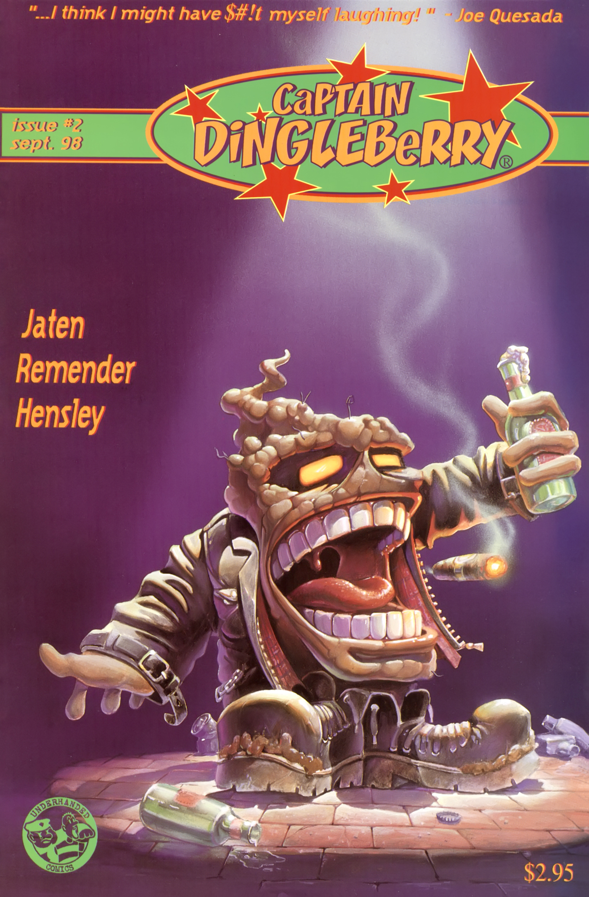 >Ah the smell of sweet justice! Caution evil-doers, Captain Dingleberry is here! Tasty art, a great adventure/comedy story, and unbelievable characters what else could you want. So drop your latest issue of Blood Blade Claw Force˛ (or whatever), and come try a happenin' heroic treat.In 1998, industry animators Rick Remender and Harper Jaten self-published a comic for four issues which would later be picked up by Slave Labor Graphics.Before Remender's Marvel work like Uncanny X-Force, Uncanny Avengers, Agent Venom, etc or his creator-owned work (which Jaten has been an editor on lately) like Black Science, Deadly Class, Low, Fear Agent, etc there was Captain DingleberryLord help us all
