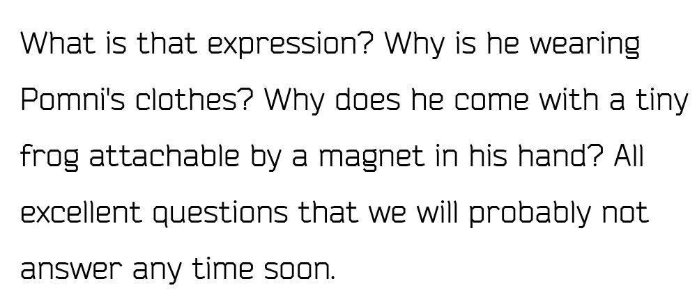 >have you ever done something which you regret?Fellas, what the fuck did Jax do in the real world? And don't say it was a car crash, it's definitely more heinous than that. It would have to be something so vile that Ribbit would likely stop being friends and eventually abstract, and would make him never want to open up again to another person. Something that would make him never want to go back to the real world.