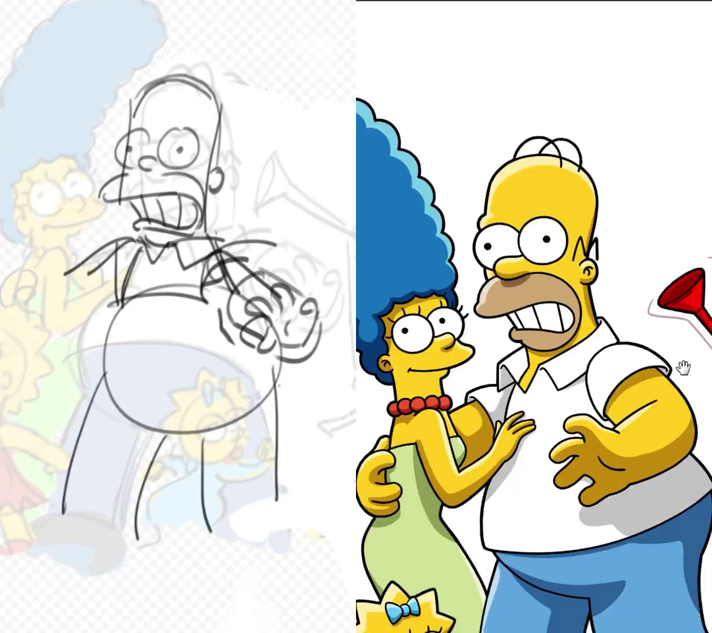 At 0:33? The Homer drawing looks the same, the Marge sketch just got redlined to match the model/scale before inking and coloring.