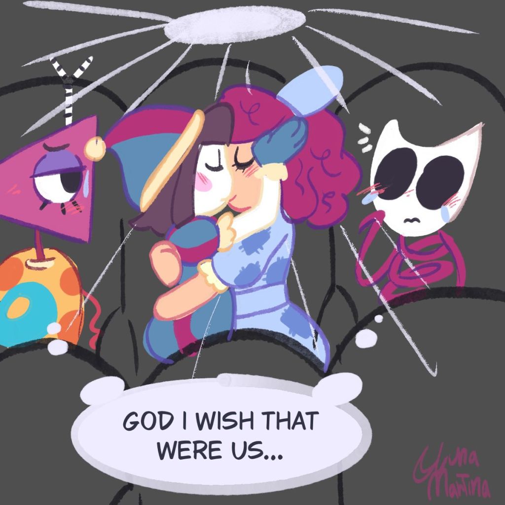 I hope Pomni and Jax kiss just as they're about to escape from the circus, only for it to be revealed that Jax joined the circus when he was just 16 and somehow hasn't aged during his time there, and then Pomni gets arrested for being a disgusting pedo