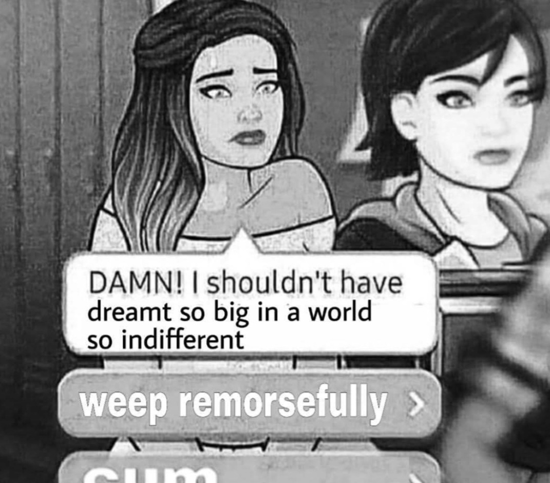 As someone who has made something of his own and is actively working on it I have some advice for the anons just starting outKeep it in the form of an animatic or a sketch, it doesn't need to be polished and getting to the level of polish you'll need to catch the eye of an audience whose attention spans are already fried by slop is an unreachable goal at this pointHere's the order of what you should focus on:1. Idea - come up with an idea for a story that makes you want to explode how bad you want to tell it or how much you want to see it done, and have fun with concepts, think about what type of story makes you the most invested (an idiotic example would be pawn stars, but something about making money is just attractive for people)2. Writing - writing is arguably more important than the initial idea but they're both up there3. Pacing - just nail it down and don't overhold a shot or a scene just because you think it's pretty4. Character designs - coombait/furbait goes a long way but other than that 40k aesthetics will also get you pretty far, everything else is gonna be an uphill battle5. Animation - this is arguably the least important part, if an idea is good it's gonna stand on it's own in the form of an animatic and honestly most of the time stuff looks better that way anyway because the viewer fills in the blanksThat's basically it, just remember if it doesn't seem interesting while looking like a sketch it's gonna take you way too much work to make it interesting with polish