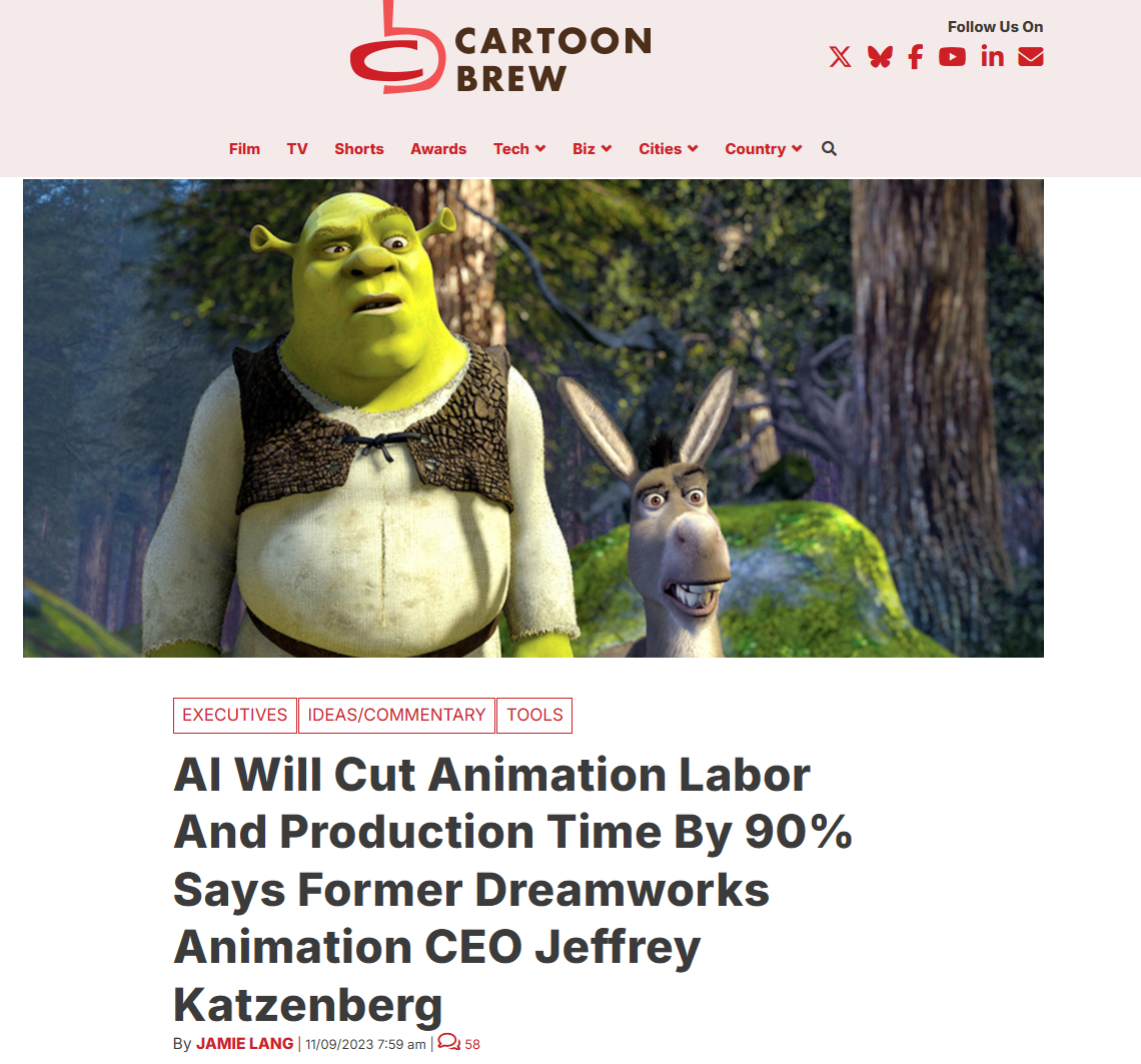 >>153330452Listen to what Katzenberg said a few years ago.Cartoons use to take hundreds of skilled animators and several years to create. AI changed all that so now 90% of those losers are gone.And we see it happen all the time. Go look up job postings at Nick or Disney. They don't even hire junior cartoonists anymore. It's all just senior animators left using AI.