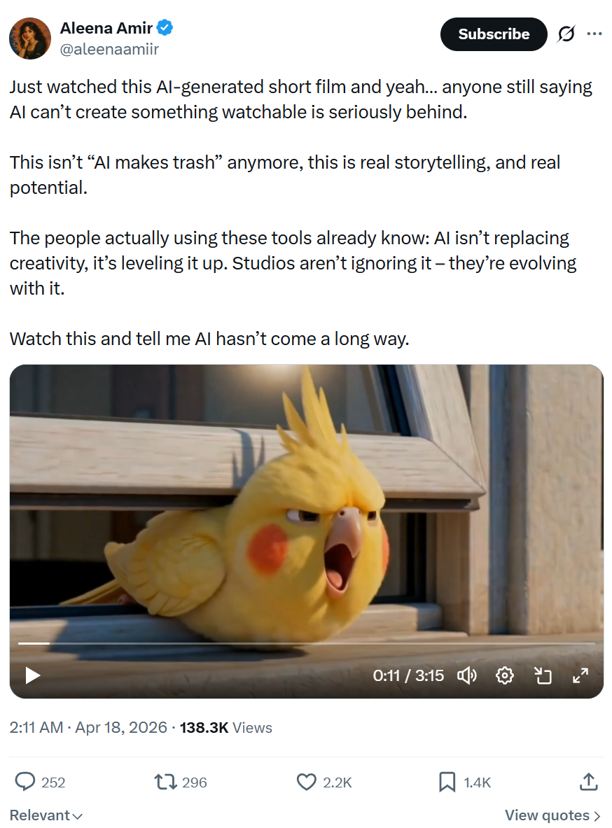 >>153332406Just watched it. It was probably one of the better longform animations I've seen done with AI, but even then it isn't much to celebrate.I am trying to make a distinction between the "writing " of the short and the visuals, assuming the writing was done traditionally and not also AI generated. Either way the plot is generic and lacking in any charm. A pet bird wants freedom and escapes really easily. Its wings are presumably clipped so it can't fly but it manages to get to the park. It meets some wild birds who take him in despite being a burden. The pet bird proves his worth by protecting his new family from a cat. Basic story but there is a story of some kind.In terms of the visual storytelling, it's lacking in composition and information. The beginning when looking out the window was fine, we understood his desires, but then poor editing with him exiting the window and then just cuts immediately to him falling with no connection. Surreal moment of the road that clearly featured cars driving now suddenly having pedestrians. Weird non prompted physics with a car driving by and giving the bird a delayed roll.Inside the park there is a massive inconsistency of the amount of wild birds. Seems the idea is to have a parent bird and then 3 chicks, but the number varies immensely between shots. Expressions are also lacking when the pet bird and the other birds meet. The impression would be that the parent bird is a gruff but fair authority figure who takes in the pet bird but the expressions don't really give much information about their true desires.Going to run out of space here soon but I'll say it's a valiant attempt at making something coherent but it still fails to really live up to the end result of traditional means, with its only benefit being the speed that it was created.