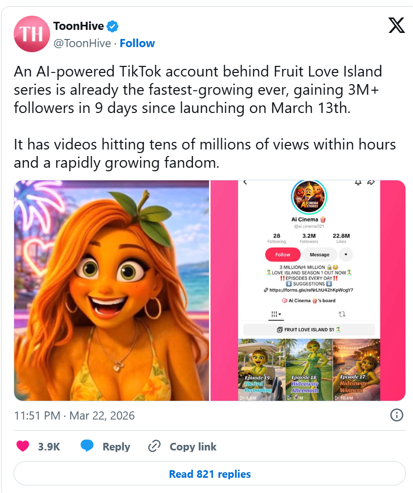 >>153337548>>153337898You're both wrong. There was just Fruit Love Island that had the fastest growth on Tiktok history.