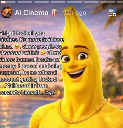 >>153338169TikTok is a haven for retarded lobotomized zoomers who will popularize anything shitty and Fruit Slop Island is no exception. And it's a perfect example of quantity over quality made with no genuine care whatsoever, they only care about virality and validation because they can't get that any other way.The owner of the page had a huge crashout and ended the series for being called out and got his videos reported churning out low-quality AIslop after AIslop. AIbros are egomanics that are extremely sensitive.