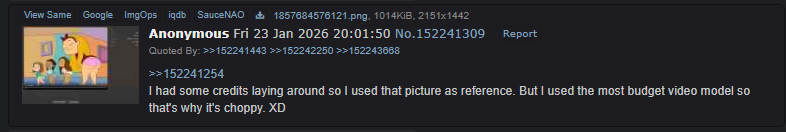 >>153329367>It's okay at generating clips but the animation looks too realistic, it doesn't understand cheats, and there's no continuity of backgrounds just for starters.AI understands better art better than most humans.There's no such as thing as too realistic. You're just jealous no one has to pay millions of dollars just to get crappy results like this anymore. Adapt or get left behind.